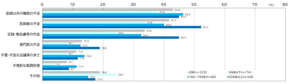 医師や職員不足が時間外労働の課題と回答した病院が40%を占め、人手不足が働き方改革の課題となり、人件費・人材派遣会社への手数料増加に影響を及ぼしている。