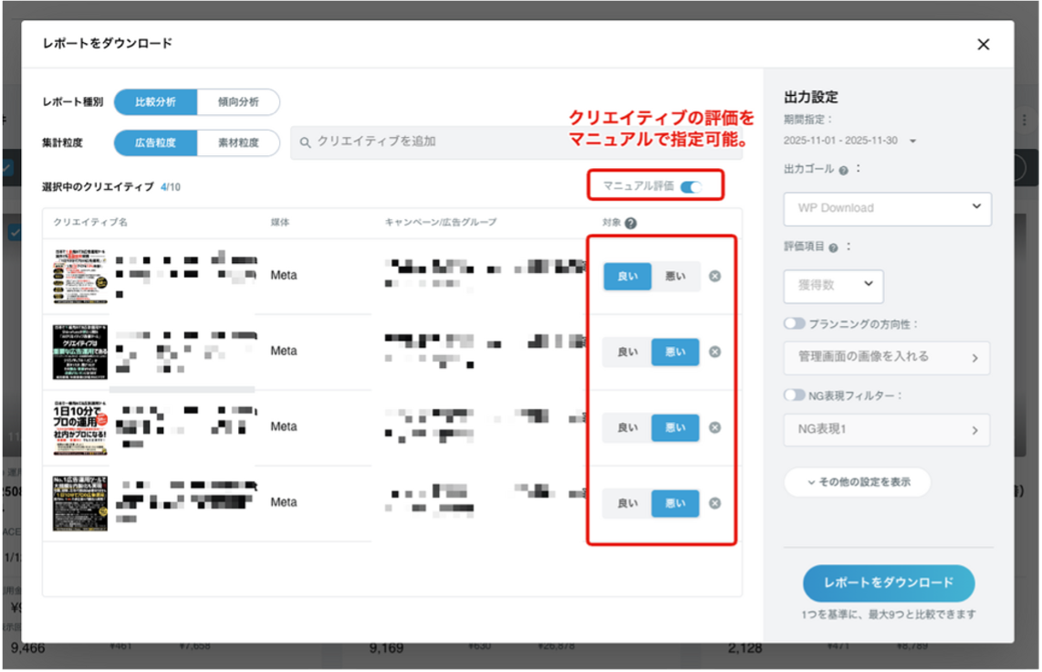 「マニュアル評価」モードをONにすることで、各クリエイティブに対して「良い」「悪い」の評価を自由に設定できます。媒体の自動評価とは異なる基準で、クリエイティブを分類して分析することが可能になります。