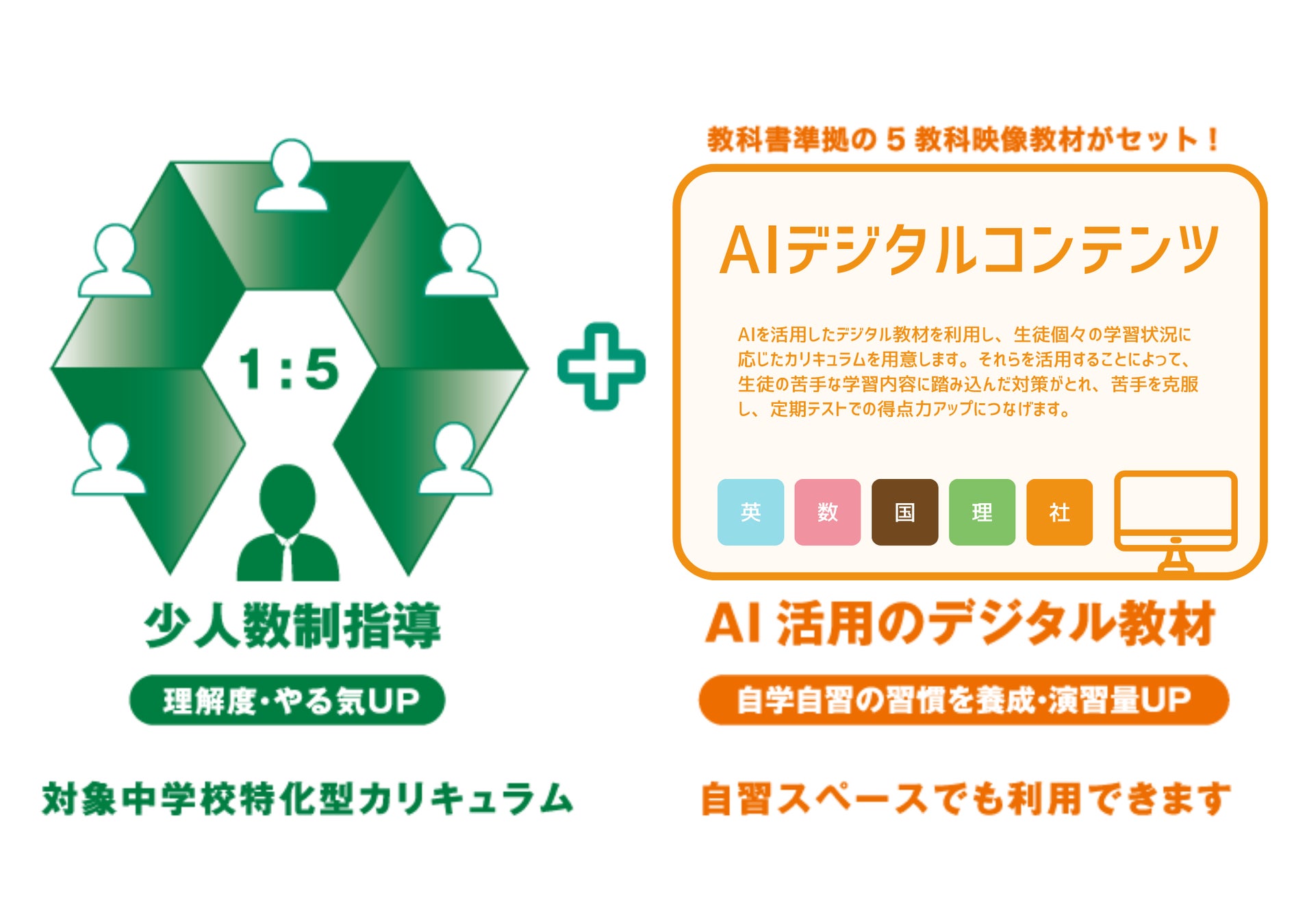 従来の1対1または1対2の個別指導に加えて、地域の特定中学校の中学生を対象とした1対5の「ベストワンPocketプラン」をご用意。地域の中学校の学習進度やスケジュールに合わせた指導や、公立高校受験に特化した指導体制を採用。対応学校を絞った中学校の専門塾として、他塾と差別化を図ります。
