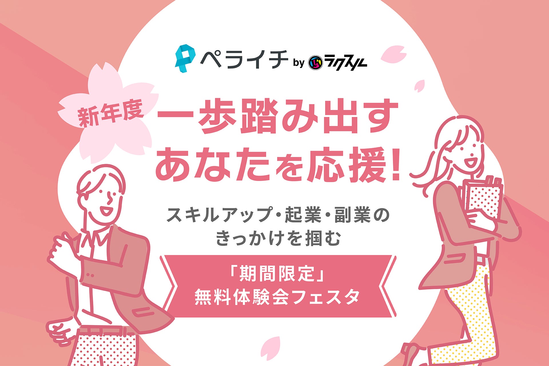 株式会社ペライチ(本社:東京都港区、代表取締役CEO:藤本旬)は、4月の新年度を前に「一歩踏み出すあなたを応援!」をテーマとしたオンラインイベント「期間限定」無料体験会フェスタを2026年3月に開催します。本フェスタでは、スキルアップや起業・副業のきっかけづくりを目的に、語学/教育、健康/美容の2カテゴリーで計4講座の無料体験会を提供します。開催日時は講座によって異なり、参加費は無料です。