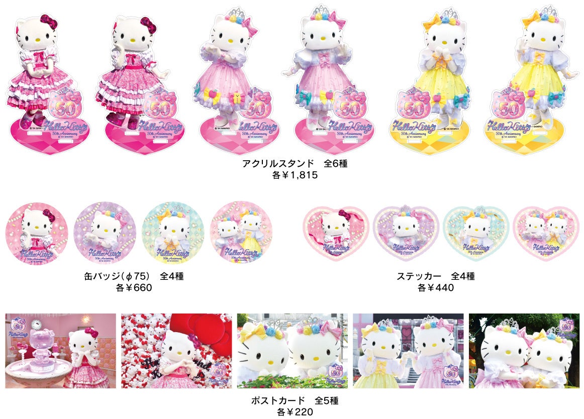 今回はキティキャッスルコスチュームのハローキティと、「パレードパラレル〜Hello Kitty 50th ver.〜」コスチュームのハローキティ・ハローミミィのライブキャラクターグッズをご用意しました。