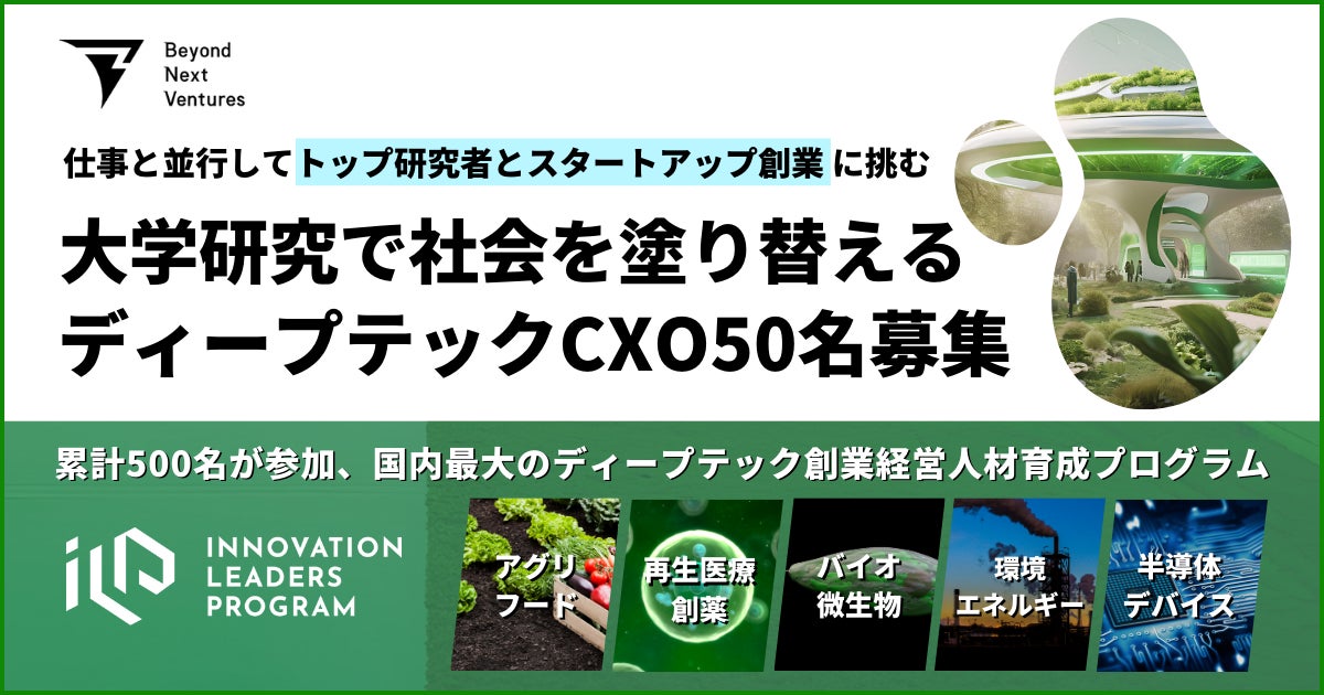 Beyond Next Ventures株式会社(本社:東京都中央区、代表取締役:伊藤毅、以下「当社」)は、当社が運営する国内最大規模のディープテック創業経営人材育成プログラム「INNOVATION LEADERS PROGRAM」(ILP)16~17期の募集を開始いたします。