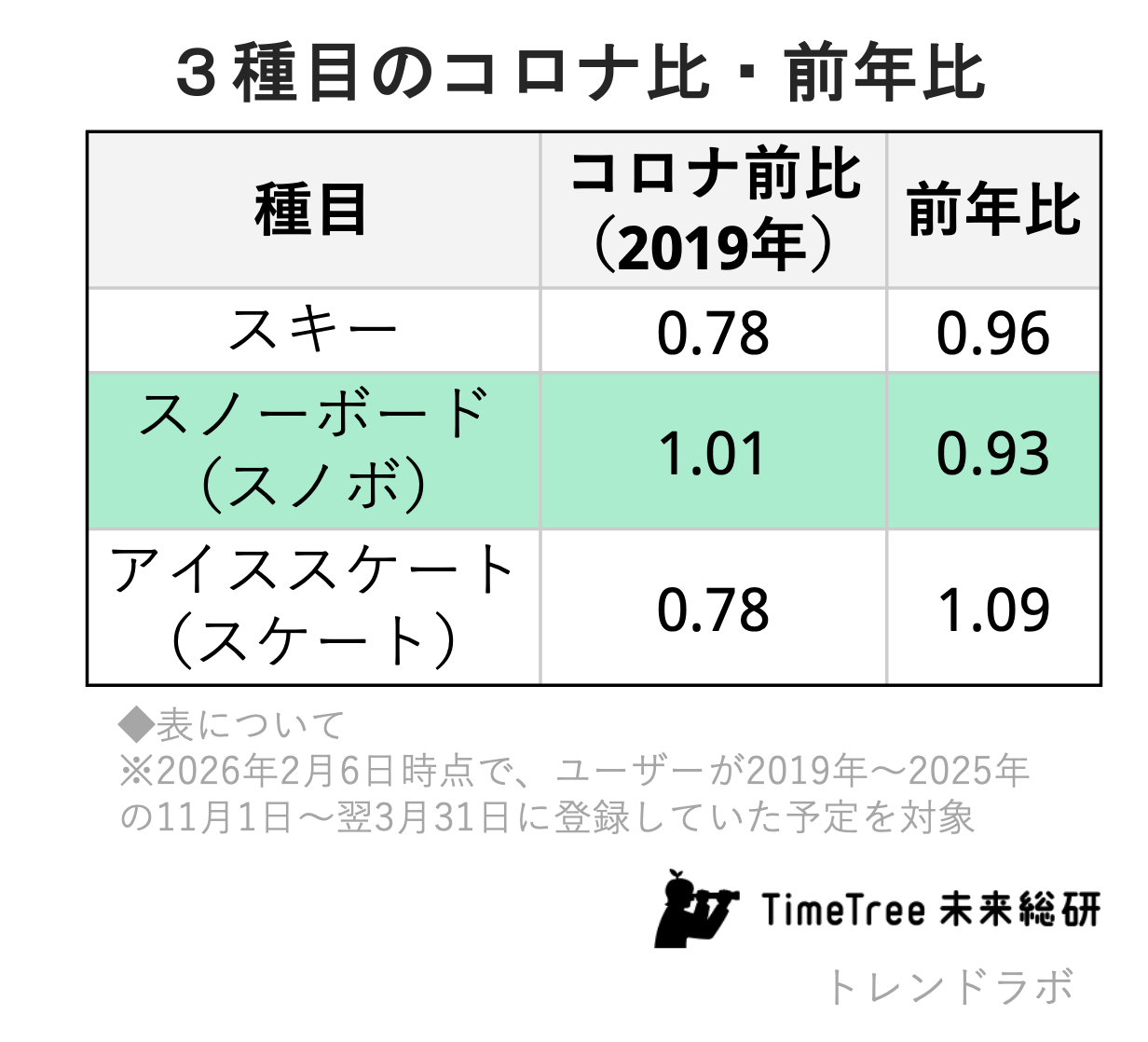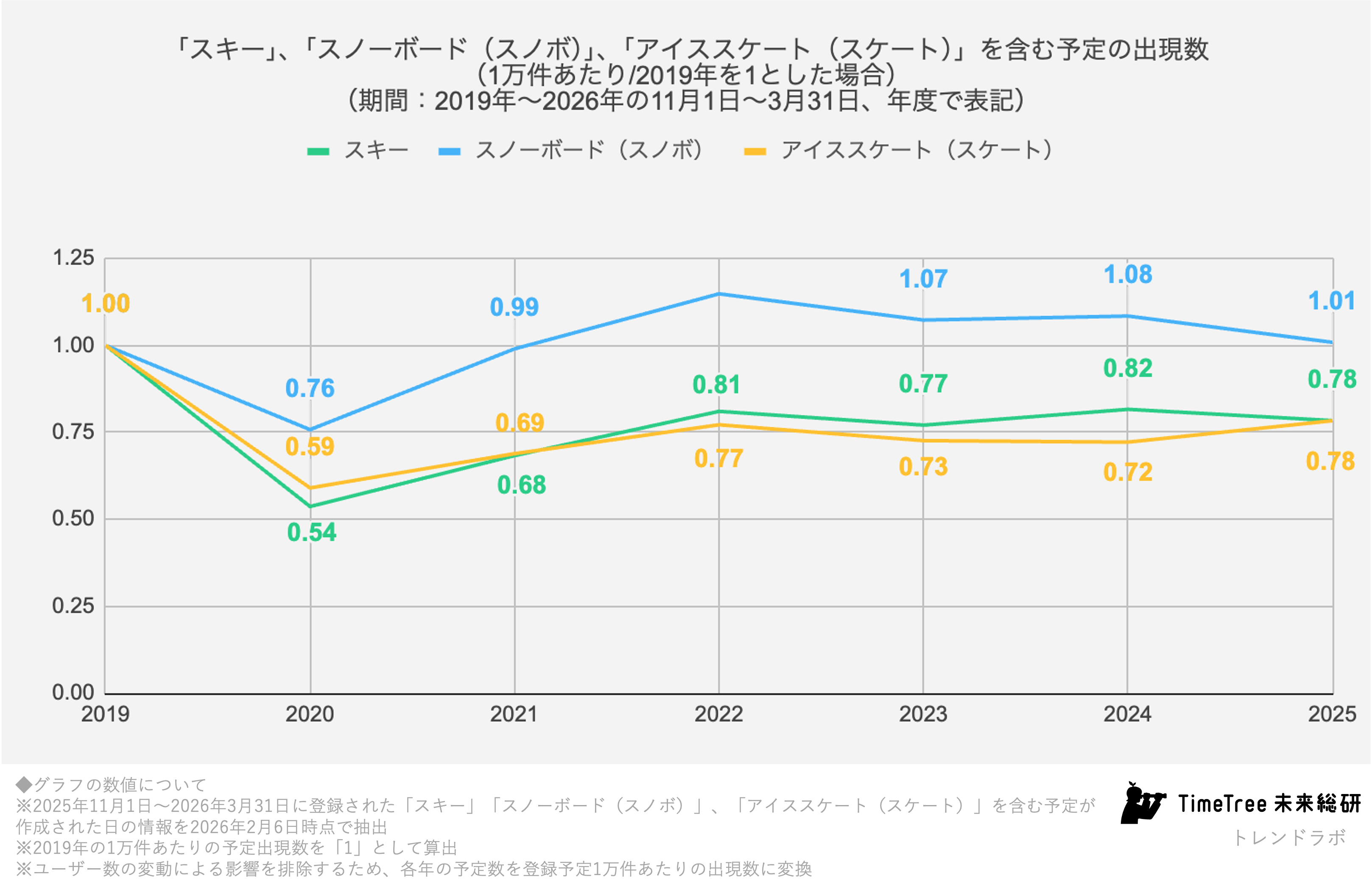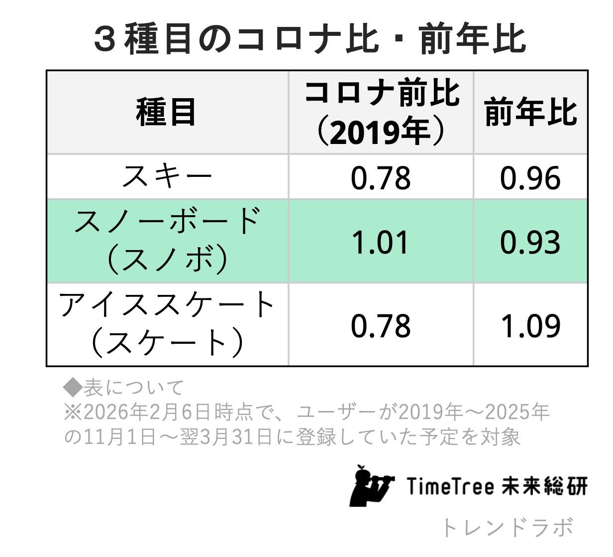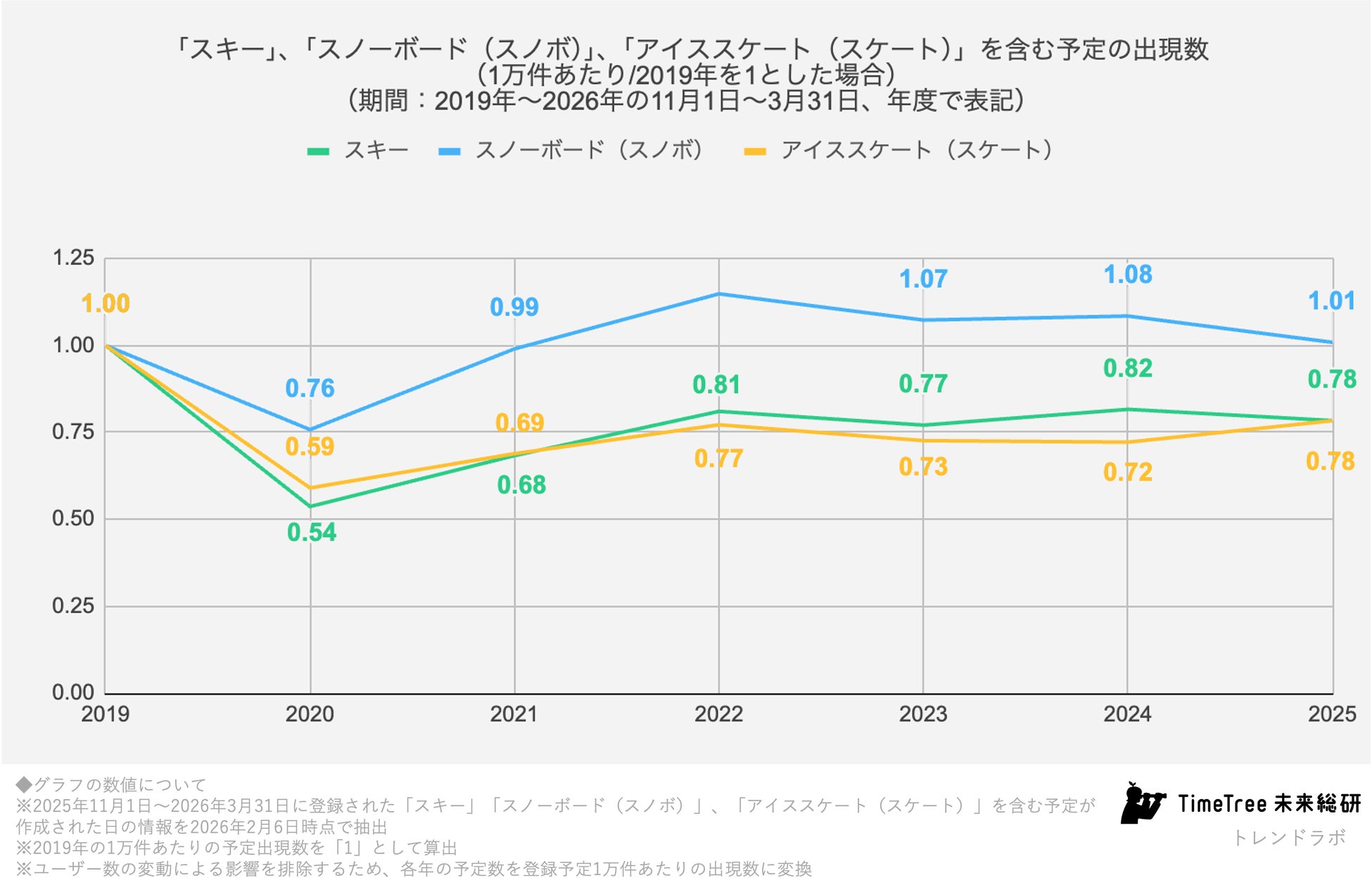 株式会社TimeTree(本社:東京都新宿区、代表取締役社長:深川 泰斗)の社内研究所『TimeTree未来総合研究所』(https://timetreeapp.com/intl/ja/future-research-institute)は、2026年2月6日、ミラノ・コルティナ冬季五輪が開幕したことを受け、スキー・スノーボード・アイススケートのウィンタースポーツに注目し、予定データを分析。3種目でそれぞれ異なる時期や年代に選ばれているのが明確になっていることが明らかになりました。スノーボードはコロナ以降2022年頃から回復傾向にあり、今シーズンは2月6日時点でコロナ前比101%となりました。さらに回復基調の背景には20代を中心とした若者層が牽引していることが明らかになりました。一方、30代以降はスキーが上回り40代がピークとなるなど、ファミリーで楽しむアクティビティとして定着している様子が伺えました。また、アイススケートはコロナ以降微増しながら回復傾向にあり、前年比は3種目の中で109%と唯一の成長を示しました。