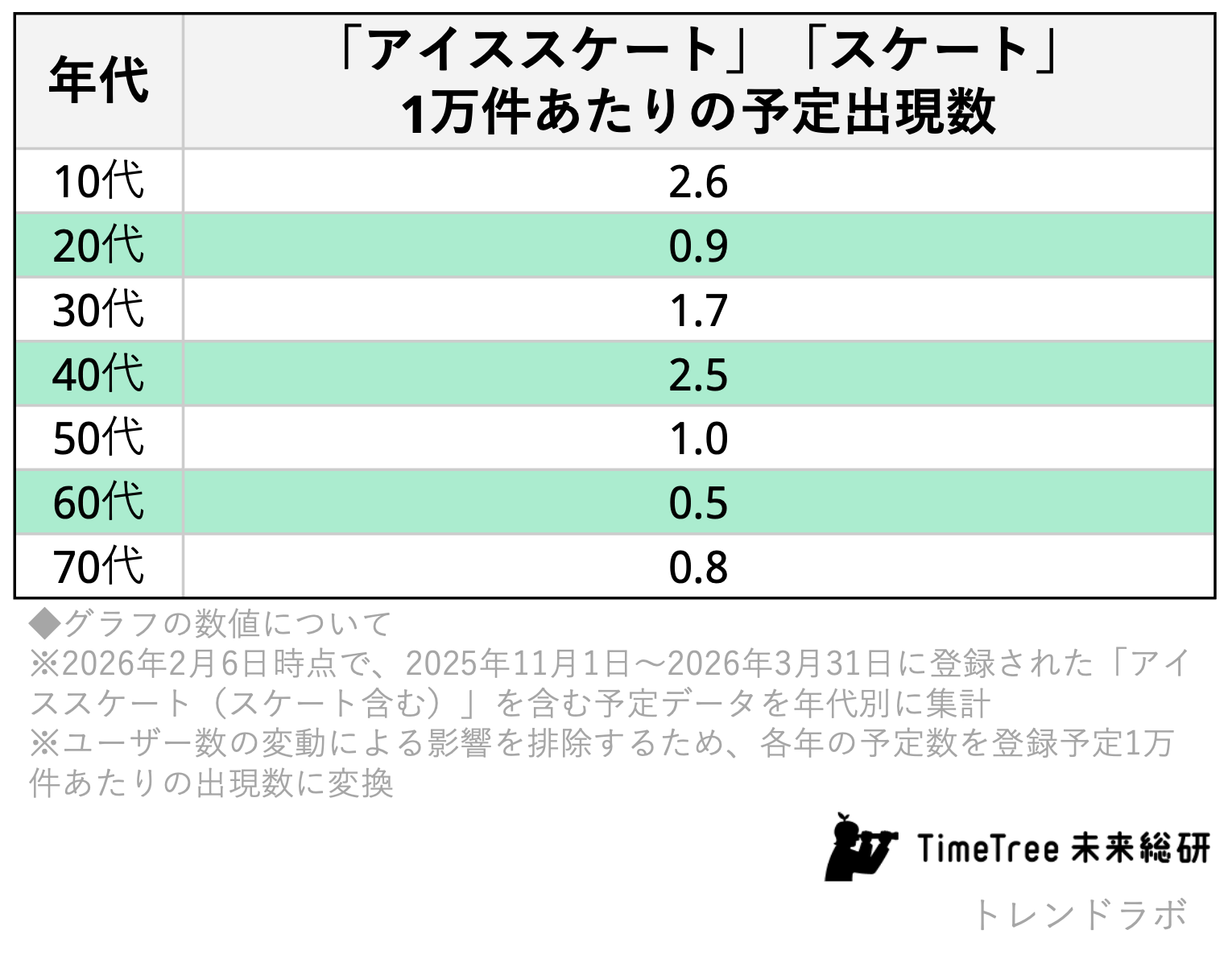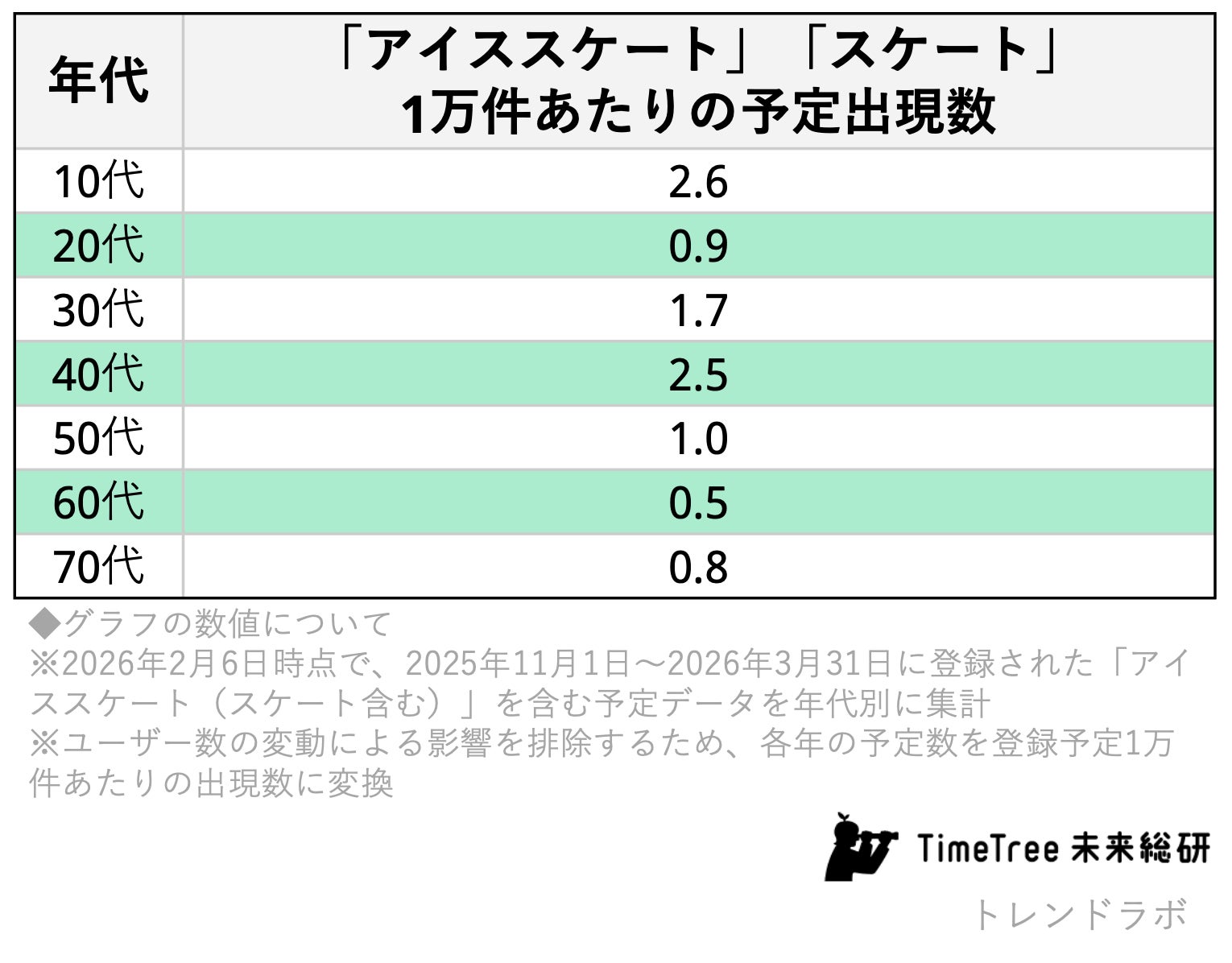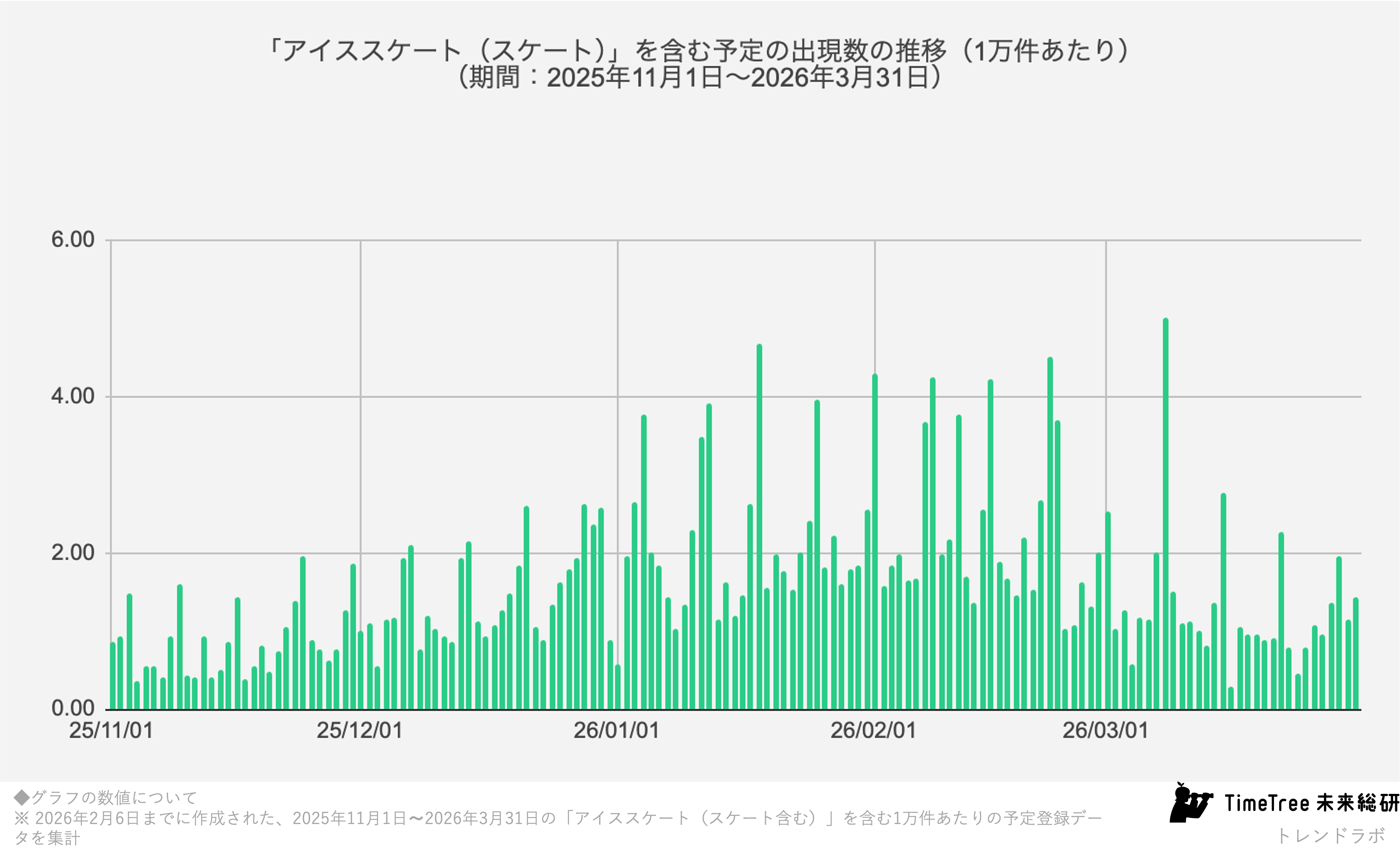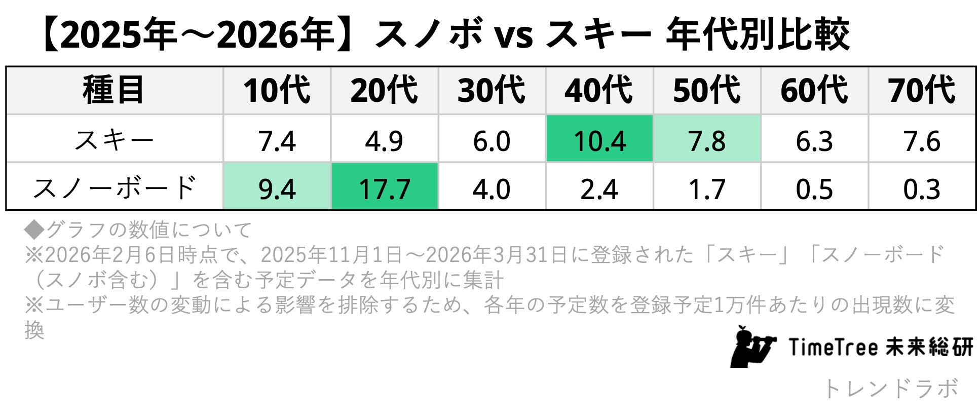 株式会社TimeTree(本社:東京都新宿区、代表取締役社長:深川 泰斗)の社内研究所『TimeTree未来総合研究所』(https://timetreeapp.com/intl/ja/future-research-institute)は、2026年2月6日、ミラノ・コルティナ冬季五輪が開幕したことを受け、スキー・スノーボード・アイススケートのウィンタースポーツに注目し、予定データを分析。3種目でそれぞれ異なる時期や年代に選ばれているのが明確になっていることが明らかになりました。スノーボードはコロナ以降2022年頃から回復傾向にあり、今シーズンは2月6日時点でコロナ前比101%となりました。さらに回復基調の背景には20代を中心とした若者層が牽引していることが明らかになりました。一方、30代以降はスキーが上回り40代がピークとなるなど、ファミリーで楽しむアクティビティとして定着している様子が伺えました。また、アイススケートはコロナ以降微増しながら回復傾向にあり、前年比は3種目の中で109%と唯一の成長を示しました。