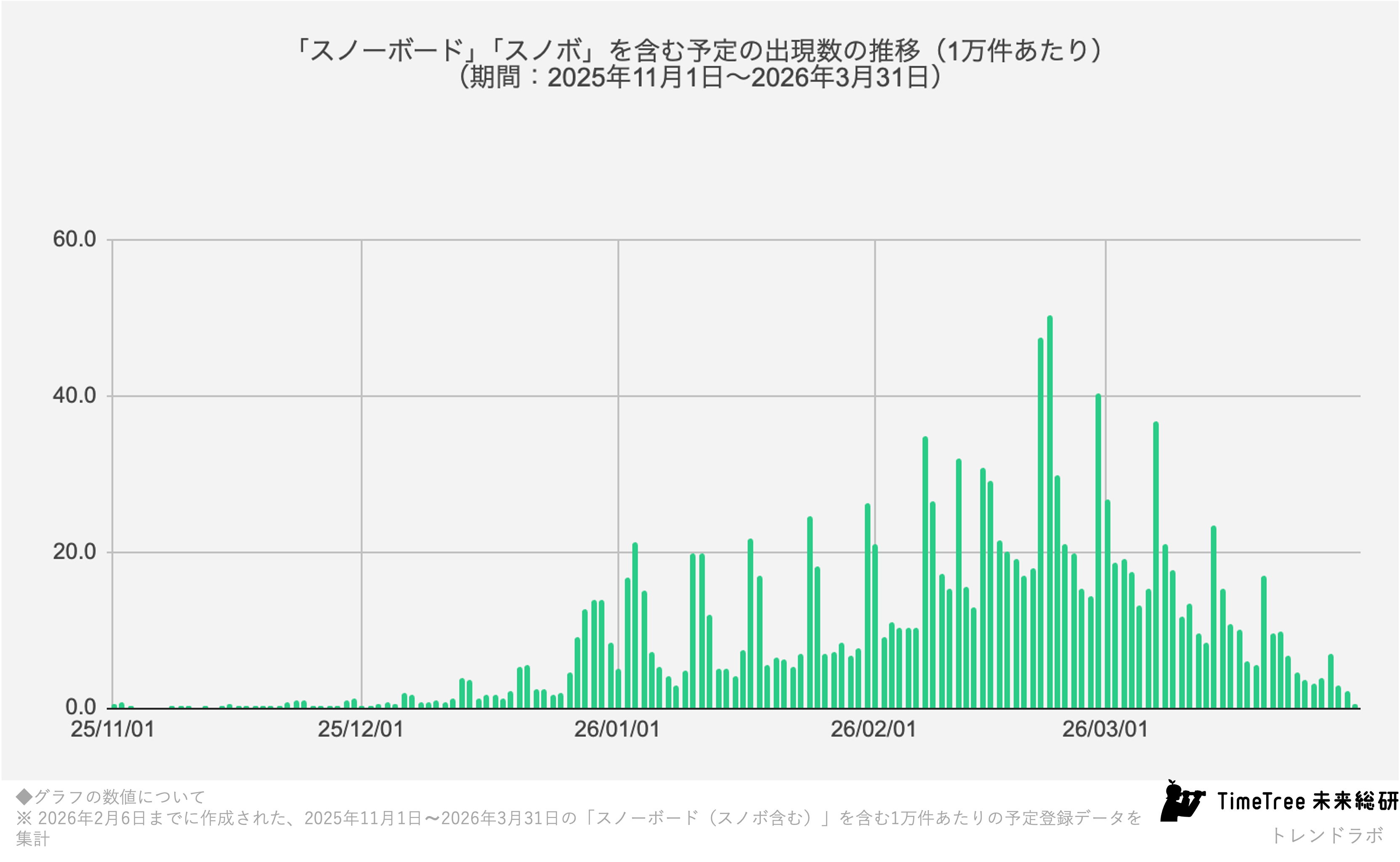 スノーボード(『スノボ』キーワード含む)の日別の推移をみると、11月から徐々に高まり、1月中旬以降さらに増加、2月下旬に最大のピークを迎えることが明らかになりました。特に2月22日(日)には1万予定あたり50.3件と、全期間で最高値を記録しています。今年はさらに2月にミラノ・コルティナ五輪が開催されることから、チームジャパンの活躍から、スノーボードの予定登録数は今後も伸び続けるかもしれません。