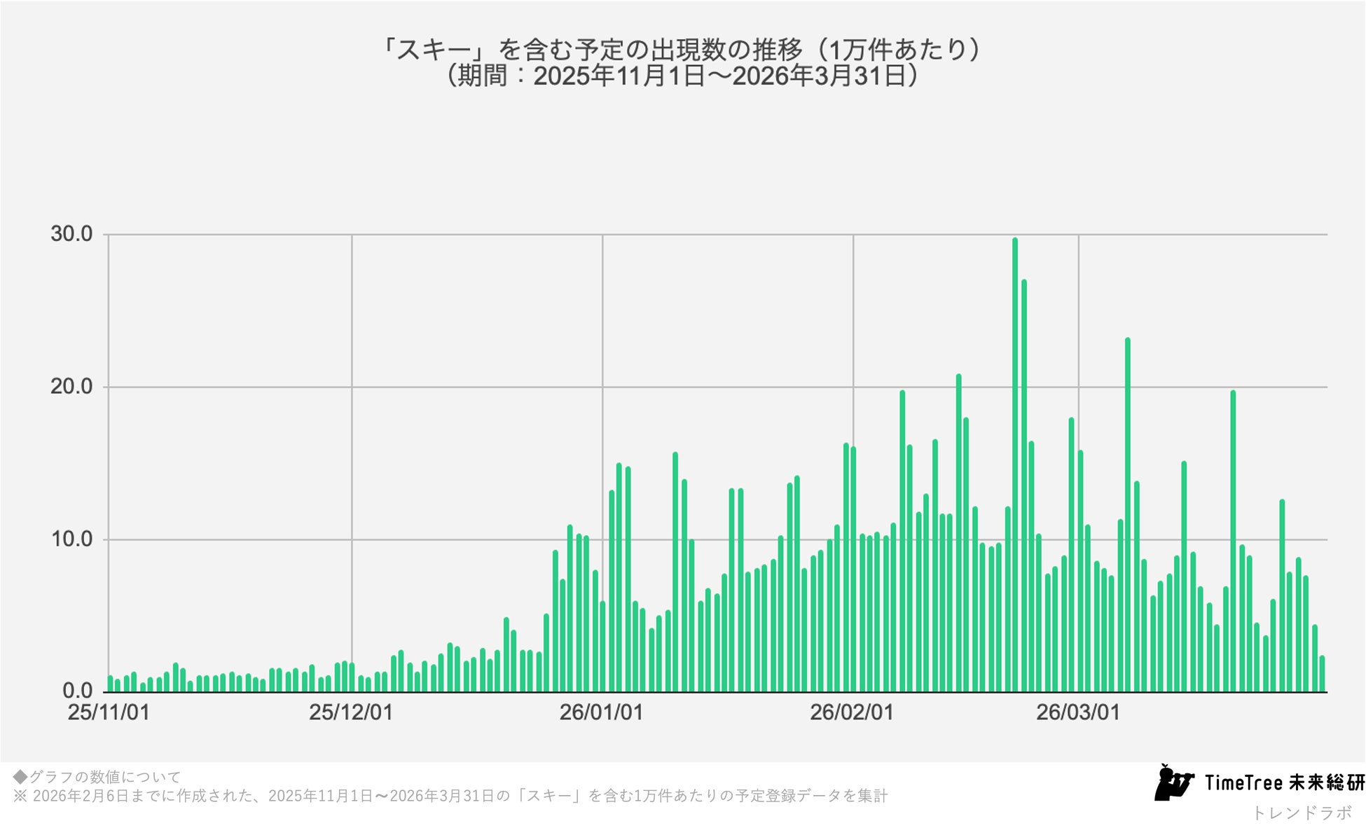 日別の予定の推移をみると、スノーボードと同様に、2月中旬〜下旬に大きなピークを迎えるスキー。2月21日(土)には29.9件と、予定登録出現数が期間中(2025年11月1日〜2026年3月31日)の最高値を記録しました。
