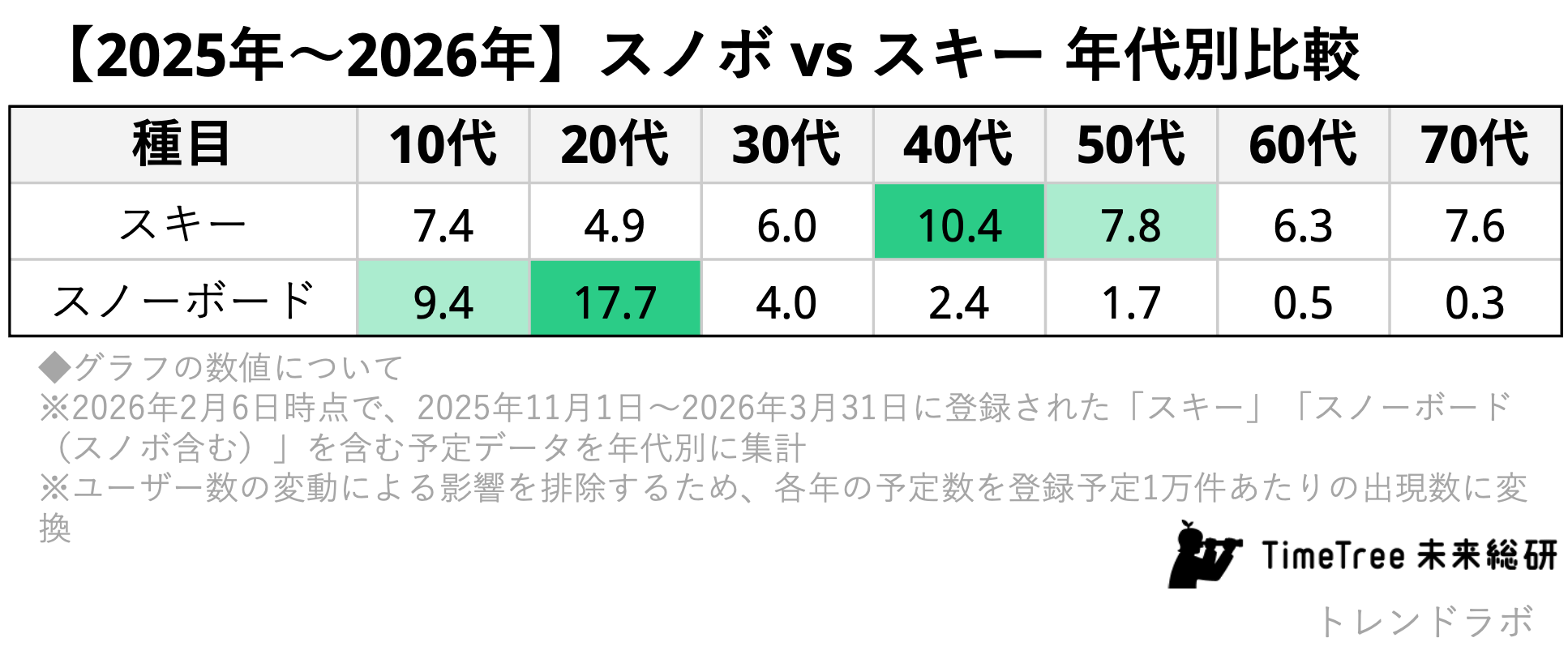 スキーは前年比96%、コロナ前比78%と回復が遅れているものの(冒頭のグラフ)、30代以降の世代では根強い人気を維持しています(【2025年〜2026年】スノボvsスキー年代別比較より)。