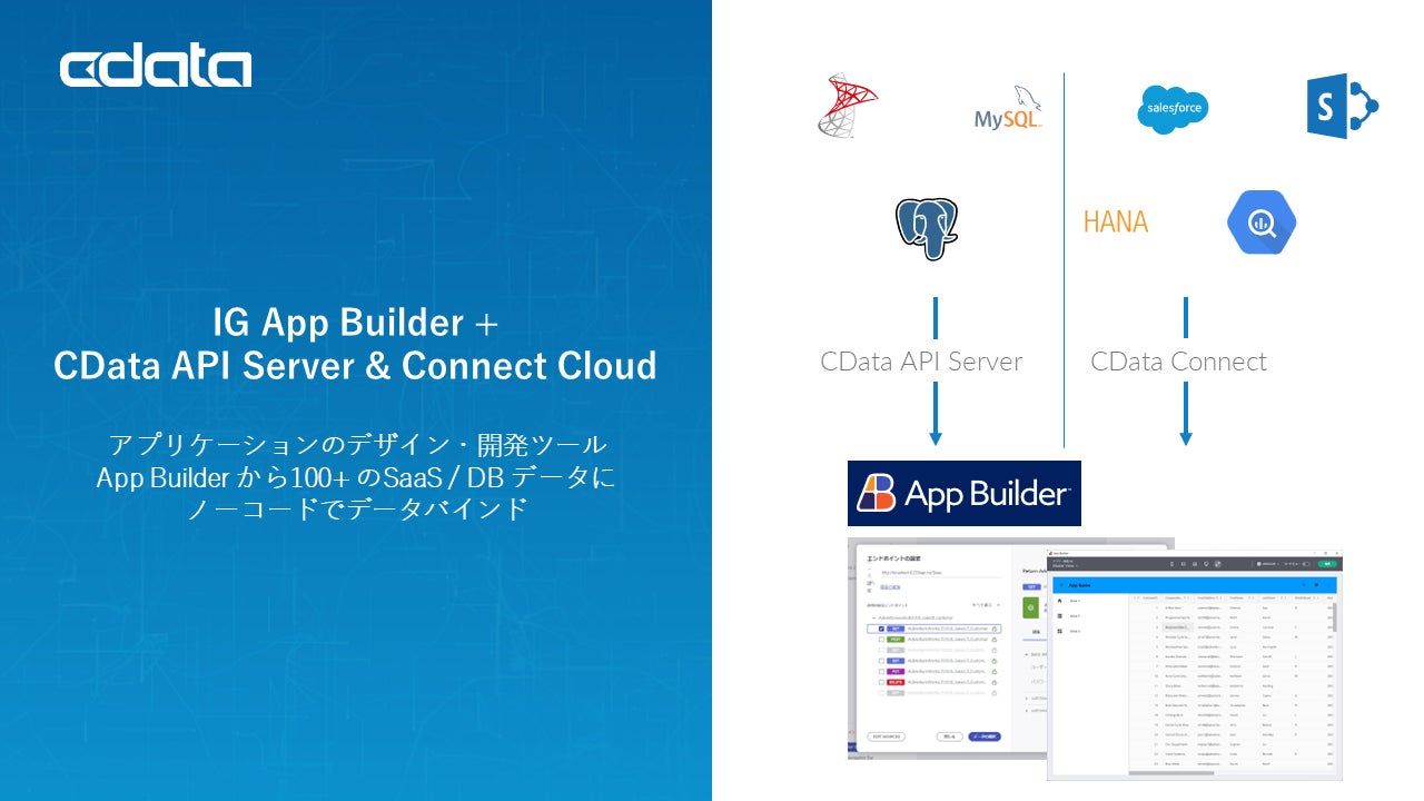 App Builder はインフラジスティックス社が提供しているアプリケーションのデザインから開発までを簡単に行えるツールです。作成したアプリケーションはそのままAngular やBlazor ベースのソースコードとして出力されて、ホスティング利用が可能です。標準機能としてOpenAPI Spec 定義の取り込みやREST API のURL 指定でのデータバンド機能があり、インフラジスティックスの高度なグリッドやUI 部品とCData が接続可能な100種類以上のSaaS / DB データをシームレスにバインド可能です。