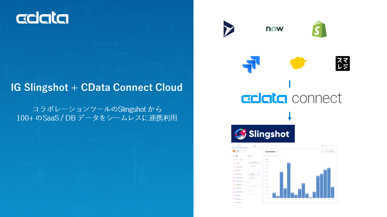 インフラジスティックス社のオールインワンのデジタルワークプレイスサービスSlingshot では、チャットやタスク管理機能に加え、各種RDB やSalesforce などのデータのダッシュボードを作成する機能が備わっています。CData のコネクティビティサービスであるCData Connect Cloud と一緒に使うことで、Slingshot からDynamics 365、ServiceNow、Shopify、スマレジといった100を超えるSaaS / RDB のデータをダッシュボード化することが可能になり、企業の幅広い活動・多様なユーザーデータを分析し、チームがデータドリブンな意思決定とアクションを行うことができるようになります。
