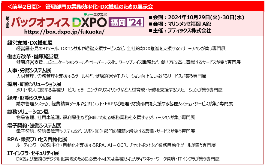 前半2日間[2024年10月29日(火)・30日(水)]開催の『第2回 バックオフィスDXPO福岡’24』は、製品ジャンル毎に9つの展示会で構成され、管理部門の業務効率化・DX推進を支援する注目のIT製品が一堂に出揃う。来場対象者は、あらゆる業種の経営層、バックオフィス部門(総務・人事・労務・経理・財務・法務・情報システム等)の方々である。