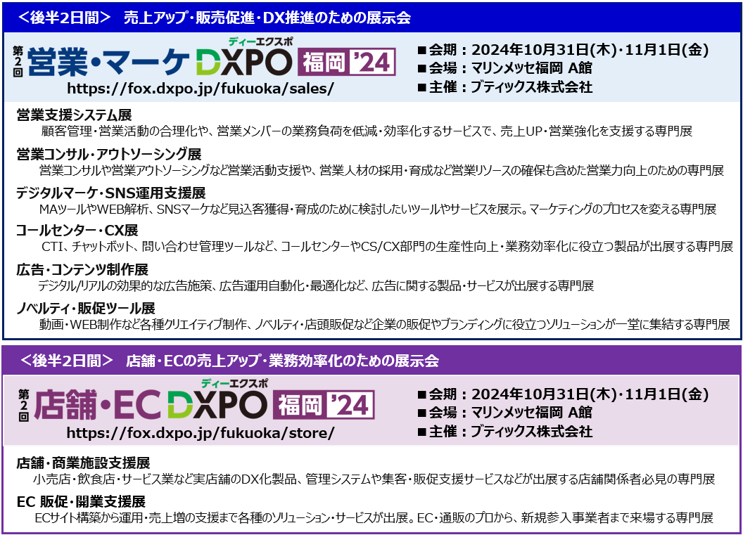 同じく後半2日間[2024年10月31日(木)・11月1日(金)]開催の『第2回 店舗・EC DXPO福岡’24』は、製品ジャンル毎に2つの展示会で構成され、実店舗のDX化・集客・販促から、ECサイトの構築・運用・売上増まで、実店舗やEC・通販で活躍する注目のIT製品が一堂に出揃う。来場対象者は、様々な店舗関係者やEC・通販のプロや新規参入事業者の方々である。