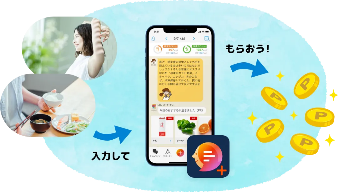「カロママ プラス」は、食事・運動・睡眠などのライフログや健康診断結果、ウェアラブルデバイスから連携したPHR(※1)に、パーソナルAIコーチ「カロママ」が、リアルタイムにパーソナルな健康アドバイスを提供するAI健康アプリです。