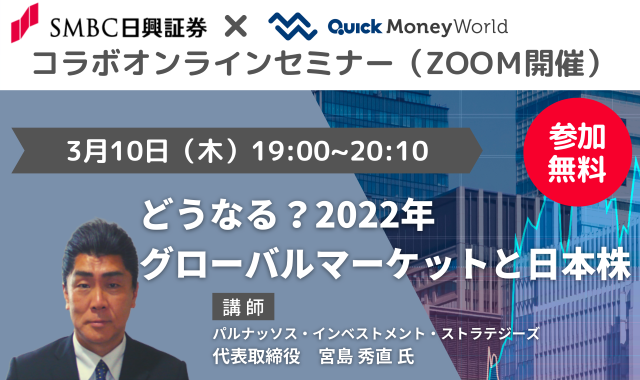 3月10日(木)に、QUICK Money Worldとのコラボオンラインセミナー「どうなる?2022年グローバルマーケットと日本株」を開催!参加費は無料、どなたでもご参加いただけます。