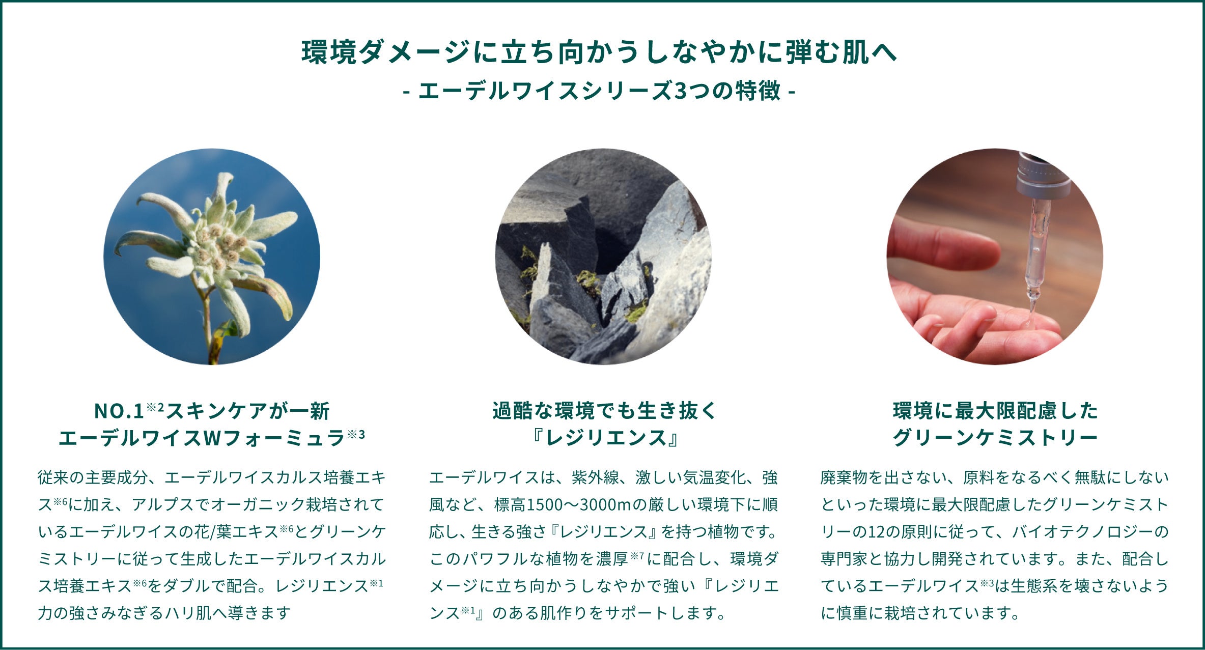 従来の主要成分、エーデルワイスカルス培養エキス※6に加え、アルプスでオーガニック栽培されているエーデルワイスの花/葉エキス※6とグリーンケミストリーに従って生成したエーデルワイスカルス培養エキス※6をダブルで配合。レジリエンス※1力の強さみなぎるハリ肌へ導きます。