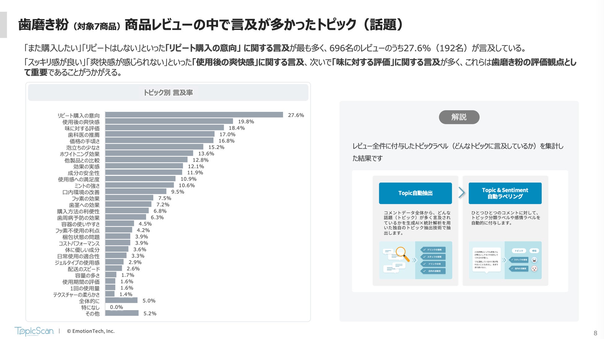 顧客体験(CX:Customer experience)や顧客の声(VoC:Voice of Customer)の活用により企業の成長を支援する株式会社エモーションテック(東京都港区、代表取締役:今西 良光、以下「当社」)は、当社が提供する「TopicScan®︎」(生成AIと統計解析を活用したテキスト分析サービス)を用いて、ECサイトに寄せられた市販の歯磨き粉7商品のレビュー696件を分析したレポート(「クチコミからひも解く歯磨き粉商品分析レポート」)を公開しましたのでお知らせいたします。