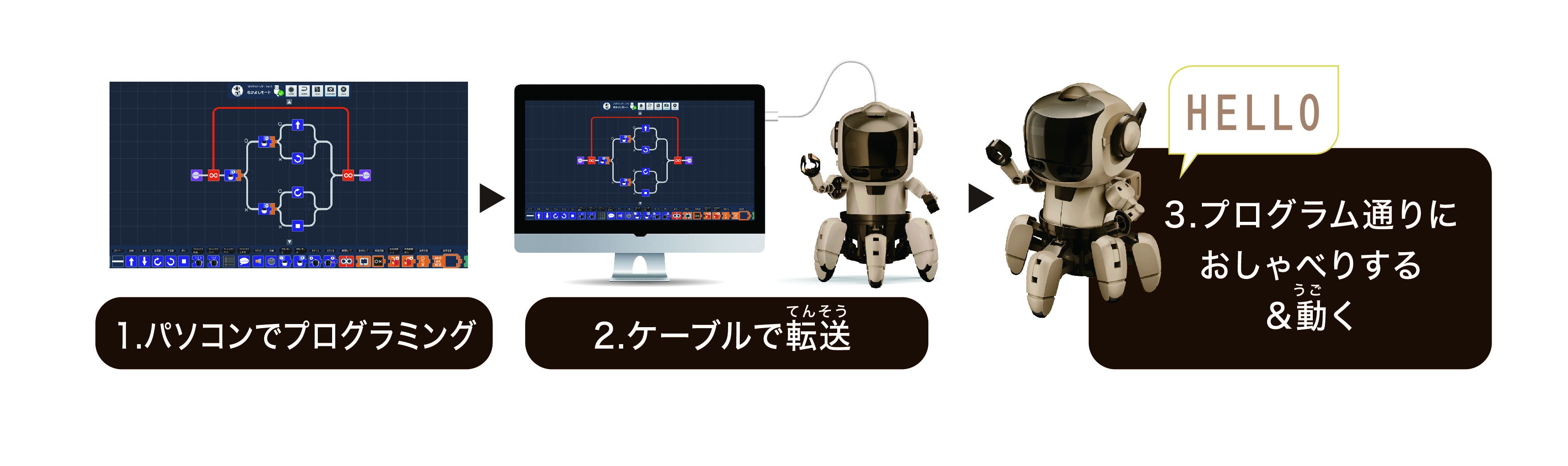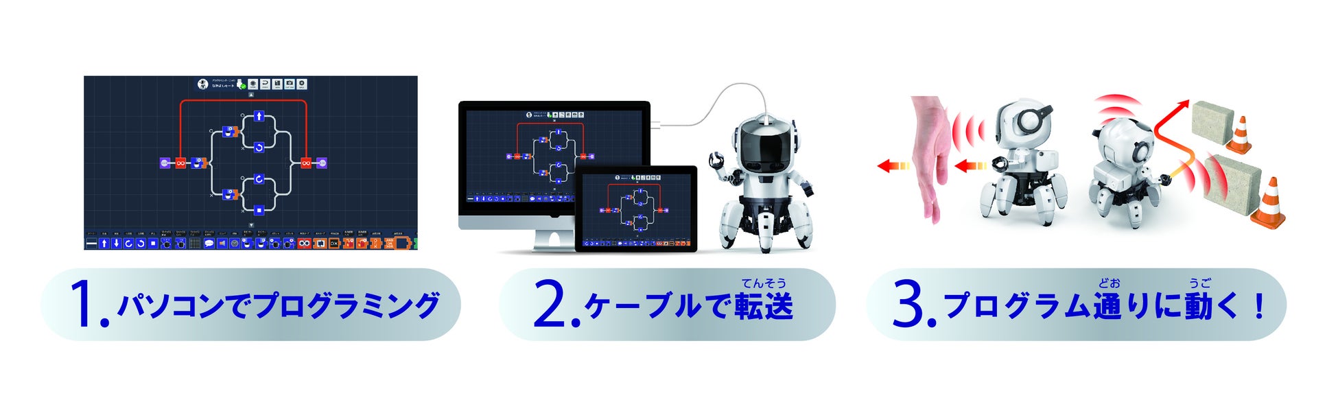 プログラムはアイコンを並べる簡単操作で作成可能。組立後すぐ動かせるように、2種類の動作をプログラム済みです。