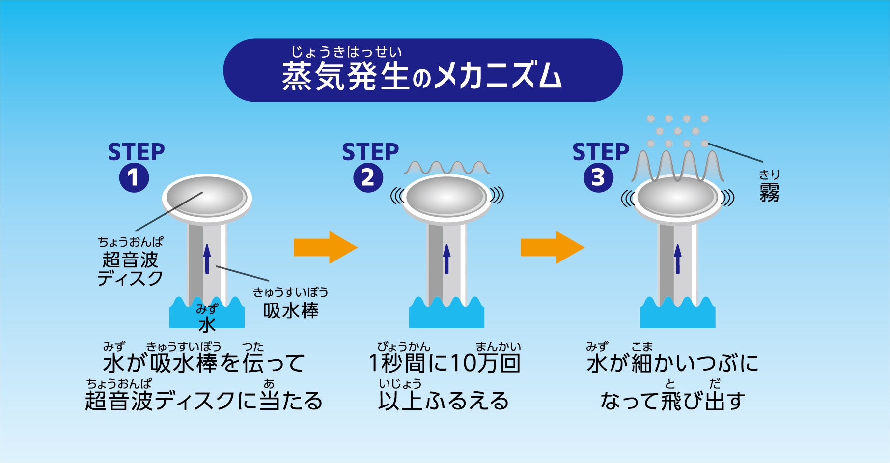 その秘密は、1秒間に10万回以上ふるえる『超音波発生装置』。この装置に水が触れると、霧のような細かいつぶになって蒸気が発生します。