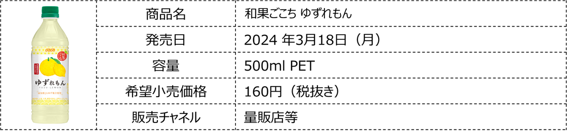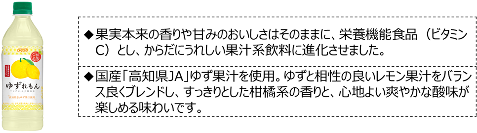 「和果ごこち ゆずれもん」は、国産「高知県JA」ゆず果汁を使用し、ゆずと相性の良いレモン果汁をバランス良くブレンドすることで、すっきりとした柑橘系の香りと心地よい爽やかな酸味が楽しめる味わいに仕上げています。