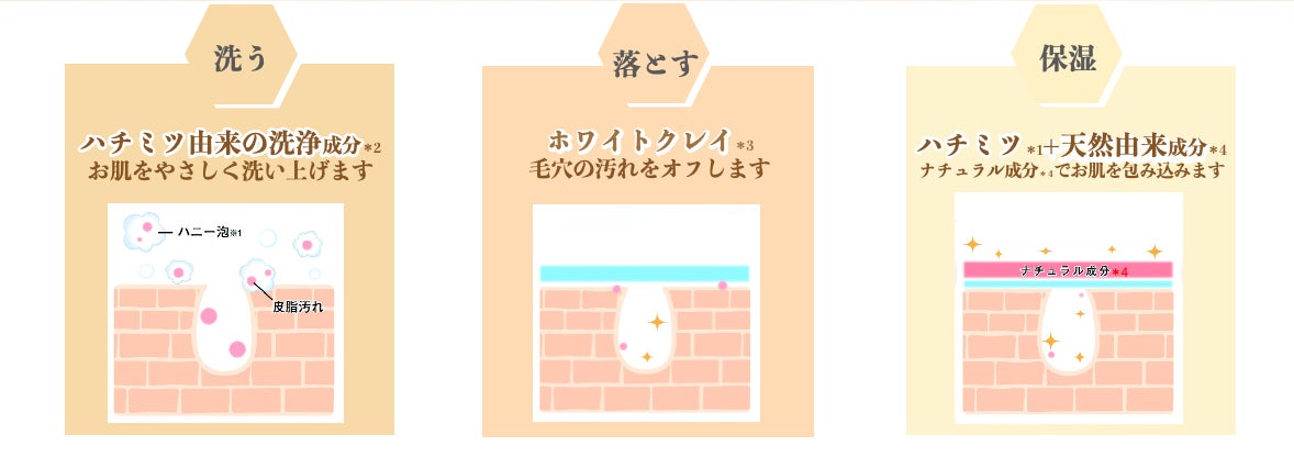 ※1 ハチミツが溶け込んだ泡のこと *1 保湿 *2 加水分解ハチミツタンパク、サボンソウ葉/根エキス *3 カオリン(毛穴ケア)*4 ホホバ種子油(整肌)、オリーブ果実油(保湿) ◯イラストは全てイメージです