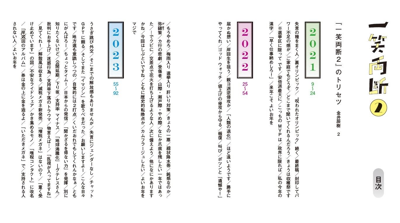 2021年に出版し、人気を博した『一笑両断』の第2弾は、東京オリンピック前後から2024年7月までの連載政治まんがから約100点を選りすぐり、解説を加えた。