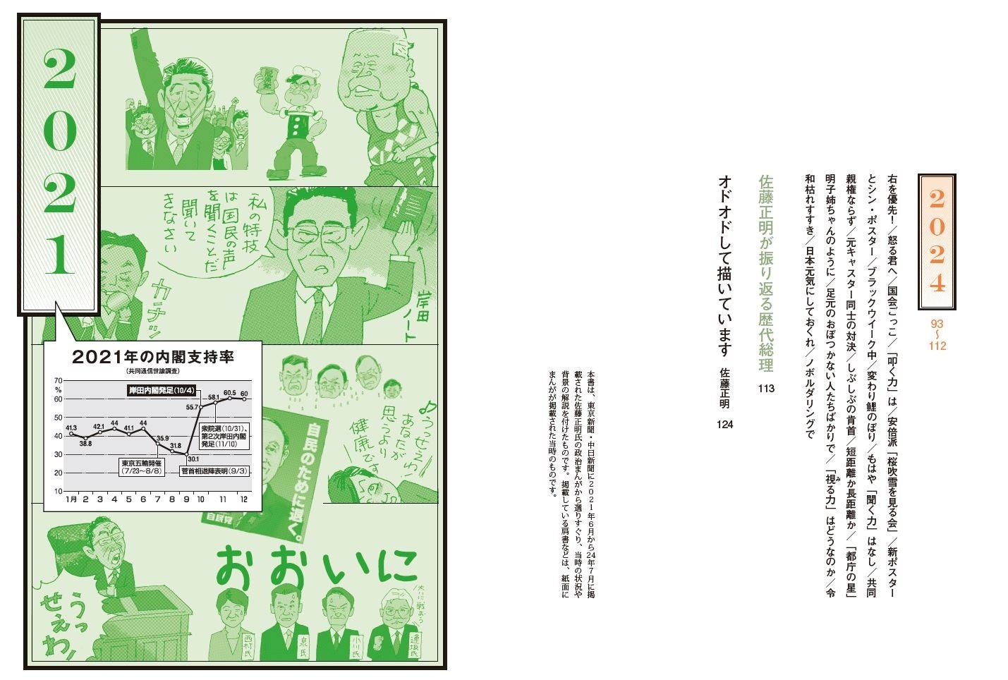 巻末には、歴代首相の似顔絵と採点表を掲載。佐藤正明氏が本紙で連載を始めた時の首相である中曽根康弘氏から岸田文雄氏までの21人(安倍晋三元首相は2回登場)について、佐藤氏が寸評する。