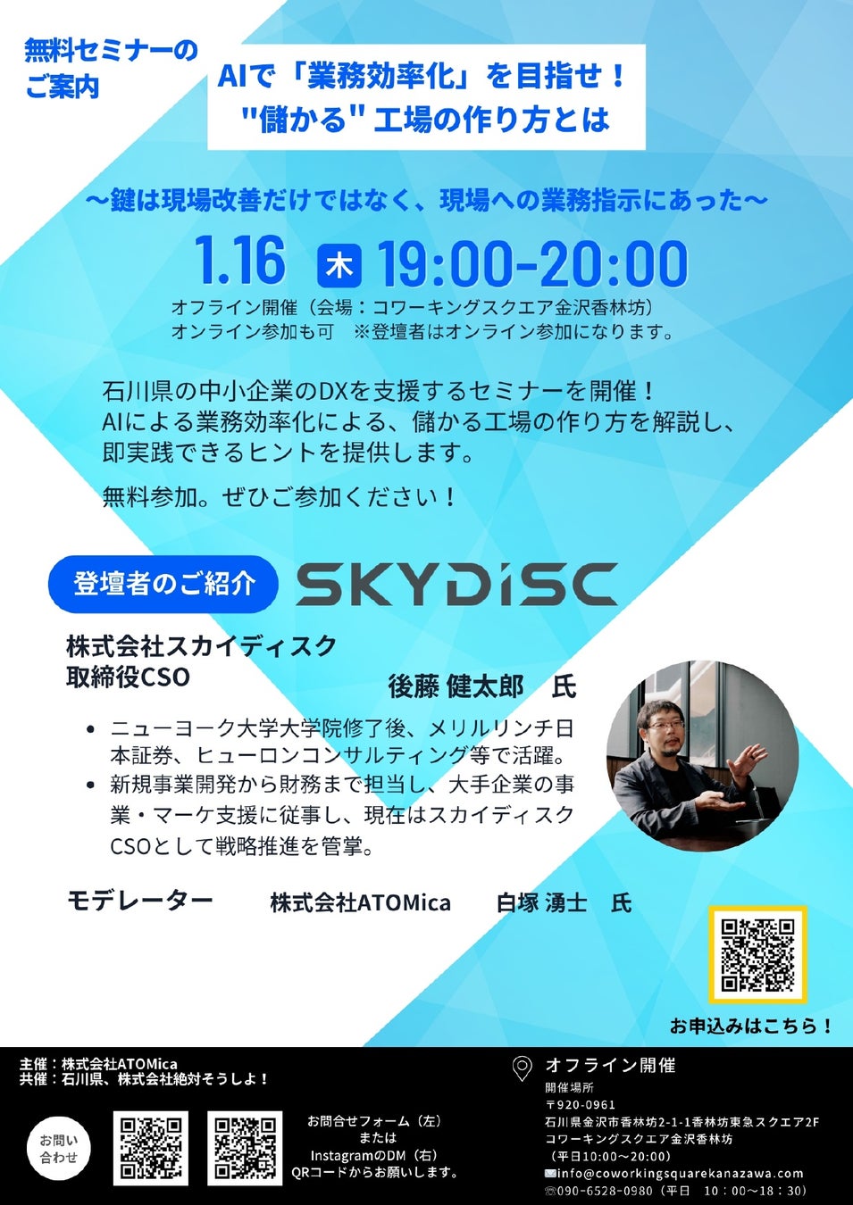 スカイディスクからは取締役の後藤が登壇し、AIによる業務効率化、儲かる工場の作り方を解説し、即実践できるヒントを提供します。モデレーターは株式会社ATOMicaの白塚湧士氏となっております。ぜひご参加ください。