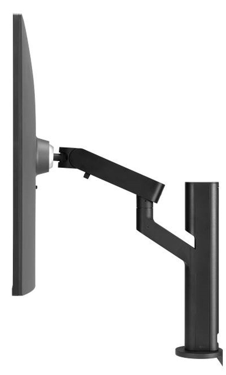 設置性においても、アームスタンドを採用し、左335゚/右335゚のスイベル(横角度調整)、前:-25゚~後:25゚のチルト角(縦角度調整)、130mmの高さ調整、ピボットに対応。姿勢や環境に合わせて、ベストなポジションに画面を配置でき、ケーブル類はすべてスタンドに格納が可能です。