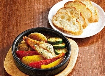 殻ごと食べられるエビとたっぷりの野菜をトッピングしました。食材の旨味がしみでたオイルをバゲットにたっぷりつけてお召し上がりください。