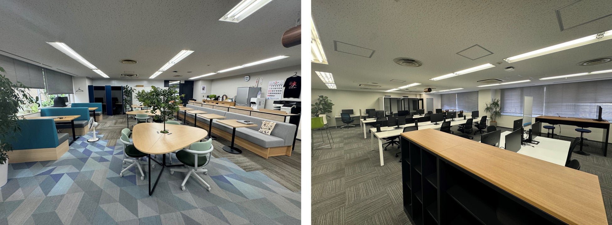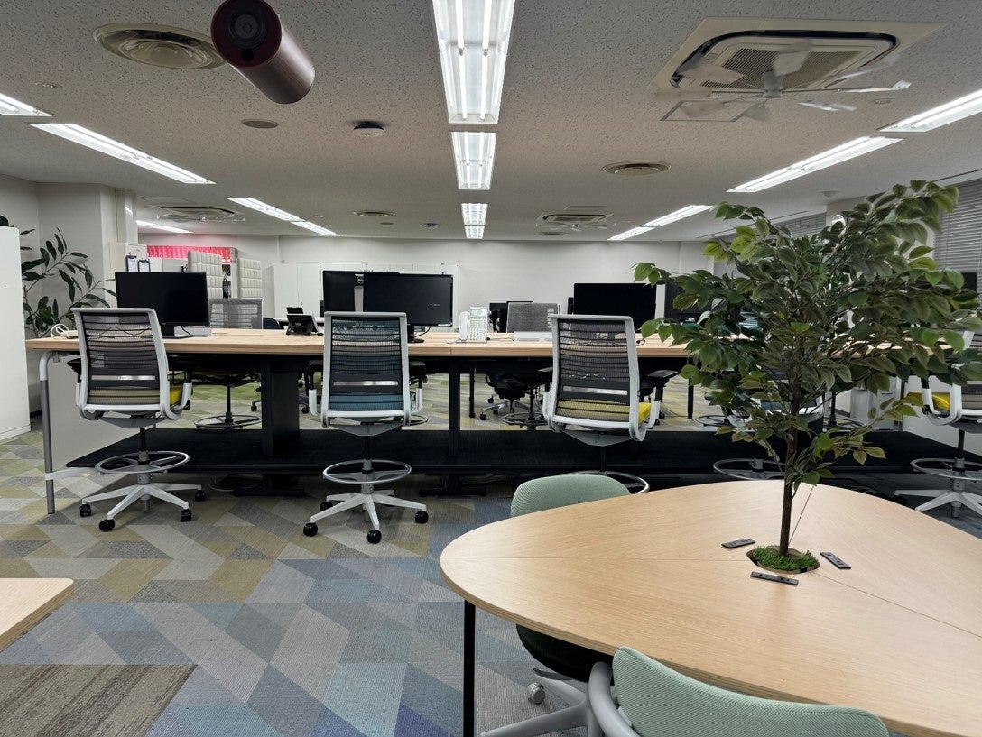 出社回帰によって出社人数が増加したことにより、座席数の不足や座席が固定化されフリーアドレス制のメリット(部署のちがうメンバーとの交流や業務に応じてチーム単位での連携して業務を行なうなど)が得られなくなる傾向があったため、座席数を増やしレイアウトを変更いたしました。併せて、部署によるエリアの固定化を避け、オフィス内での社員の流動性を高めるため、週替わりで部署ごとの業務エリアを変更し、座席の固定化を防ぐ工夫をしております。