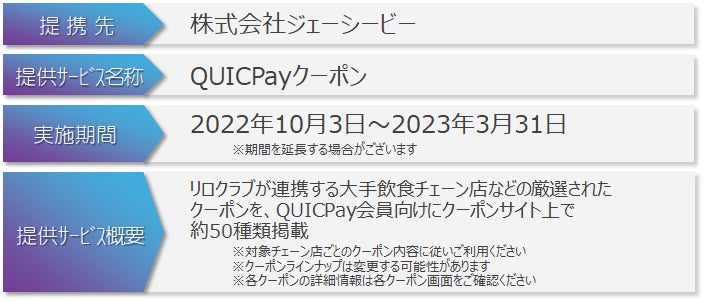 福利厚生アウトソーシングサービスのトップカンパニーである株式会社リロクラブ(本社:東京都新宿区、代表取締役社長:岡本 盛 https://www.reloclub.jp/cs-solution/)はCRM事業の分野で、株式会社ジェーシービー(本社:東京都港区、代表取締役社長:浜川 一郎 https://www.jcb.co.jp/、以下 JCB)と提携し、QUICPay会員に向けて、2022年10月3日よりクーポンサービスの提供を開始いたします。