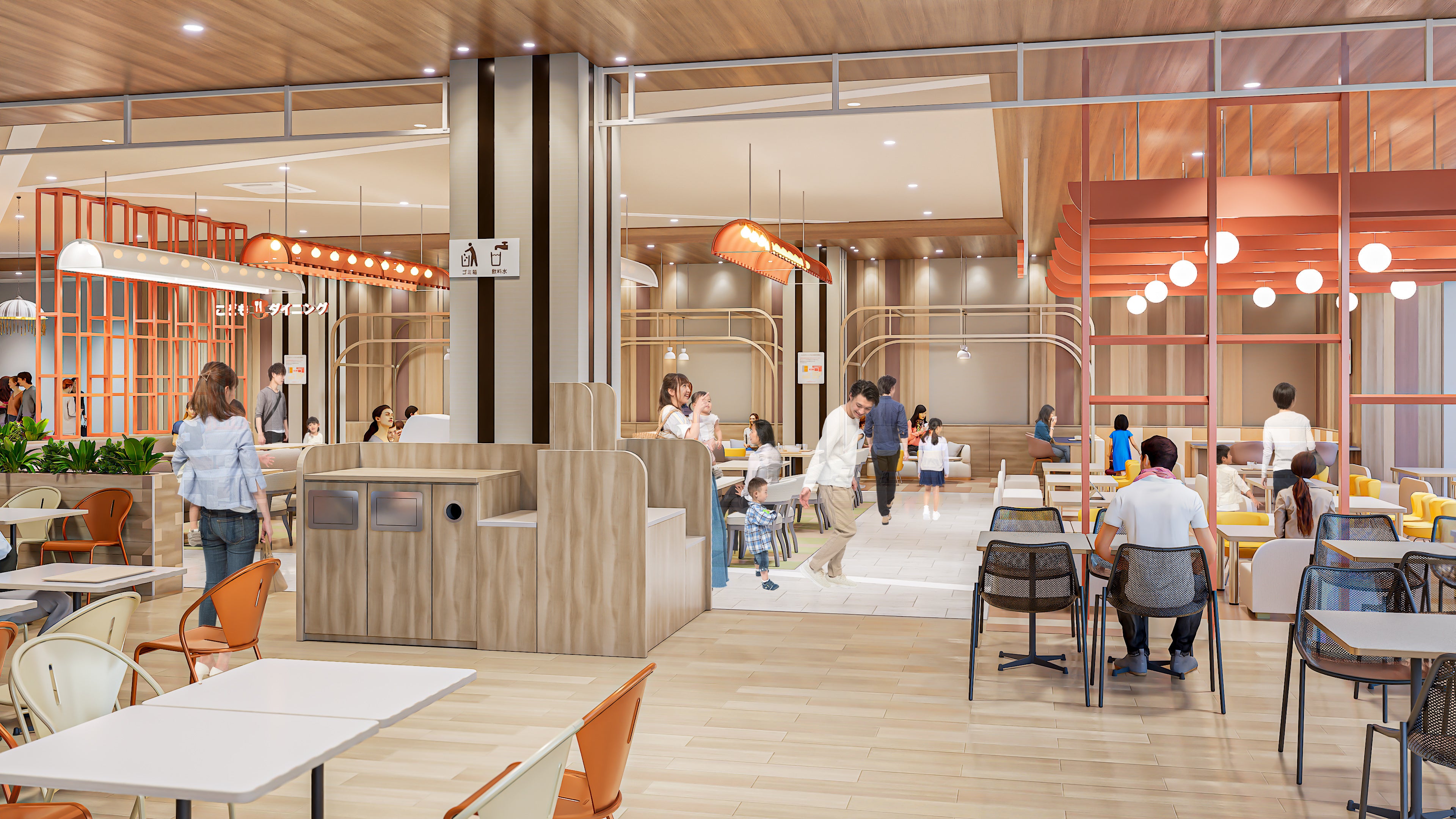 「こどもダイニング」は、小さなお子様とお連れ様が安心してお食事を楽しめる環境のご提供をコンセプトに、小さなお子様の目線に合わせたテーブル・イス・ソファを設置し、シームレスな空間でありながら、ゾーン一帯がおうちの中で過ごしているような温かみのある環境でお食事いただけます。そのほか、見守り席を設置したキッズスペースの刷新、ミルク用調乳機やベビーカー置き場を完備いたします。