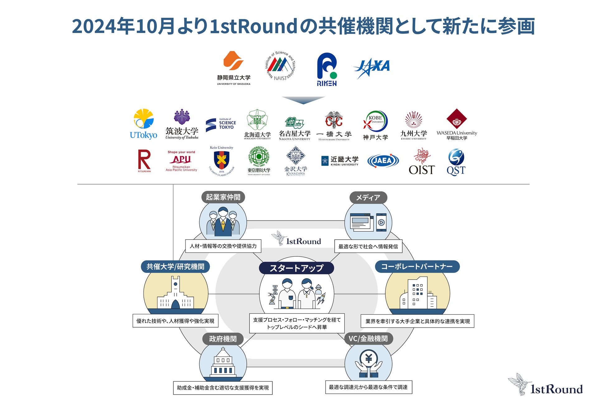 東京大学協創プラットフォーム開発株式会社(本社:東京都文京区本郷、代表取締役社長 植田浩輔、以下、「東大IPC」)と17大学、2国立研究機関による国内最大規模を誇るアカデミア共催の起業支援プログラム「1stRound」は、この度、静岡県公立大学法人静岡県立大学、国立大学法人奈良先端科学技術大学院大学(NAIST)の2大学と、国立研究開発法人理化学研究所、国立研究開発法人宇宙航空研究開発機構(JAXA)の2国立研究機関が新たに参画することに合意しました。