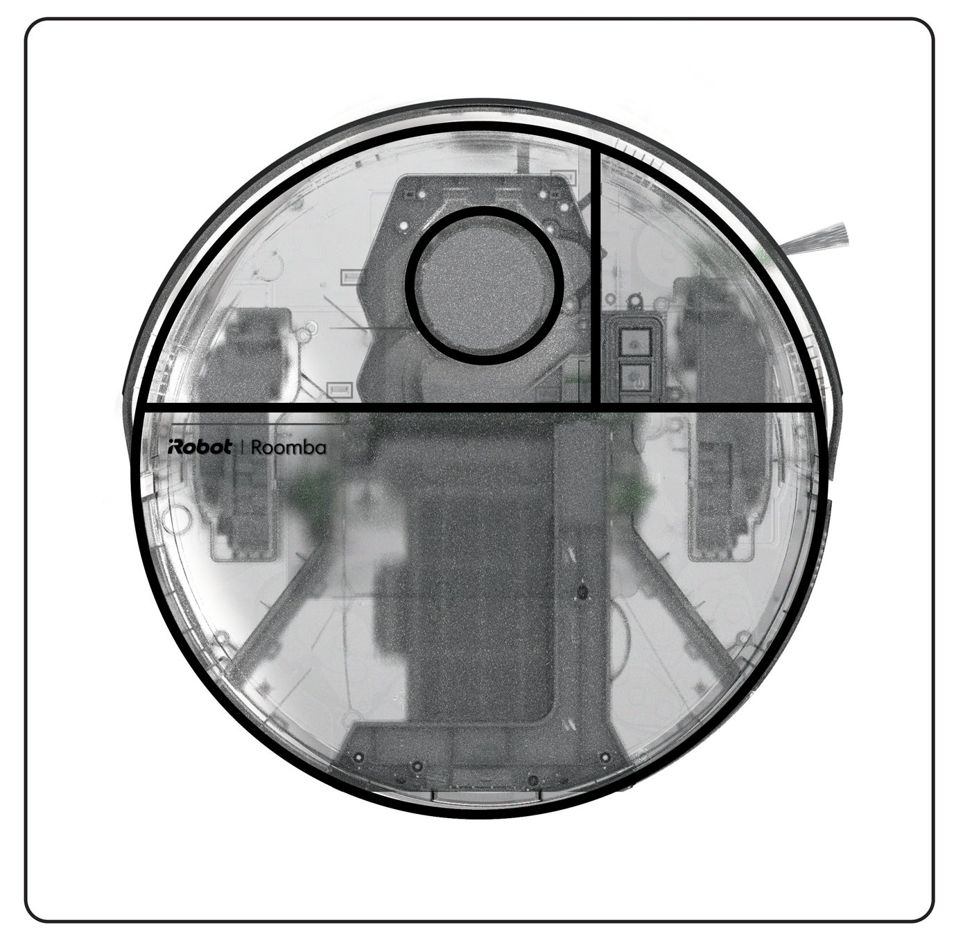 もしルンバがレントゲンを撮影したらこんな感じかと思いデザインしてみました。デザイナーとして、内部のデザインにも同等の時間を費やしています。製品の頭脳とも言えるルンバだからこそ、透明な筐体を通して内部デザインの魅力を伝えてみたいと思いました。