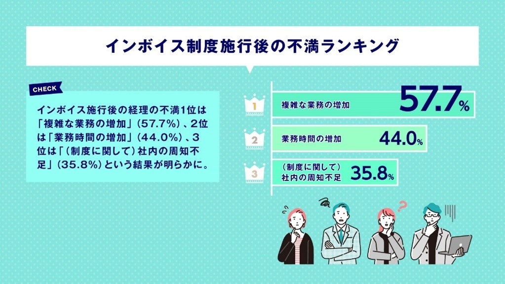 5.施行後、経理業務の不満1位は「複雑な業務の増加」(57.7%)、2位「業務時間の増加」(44.0%)、3位「社内の周知不足」(35.8%)という結果に