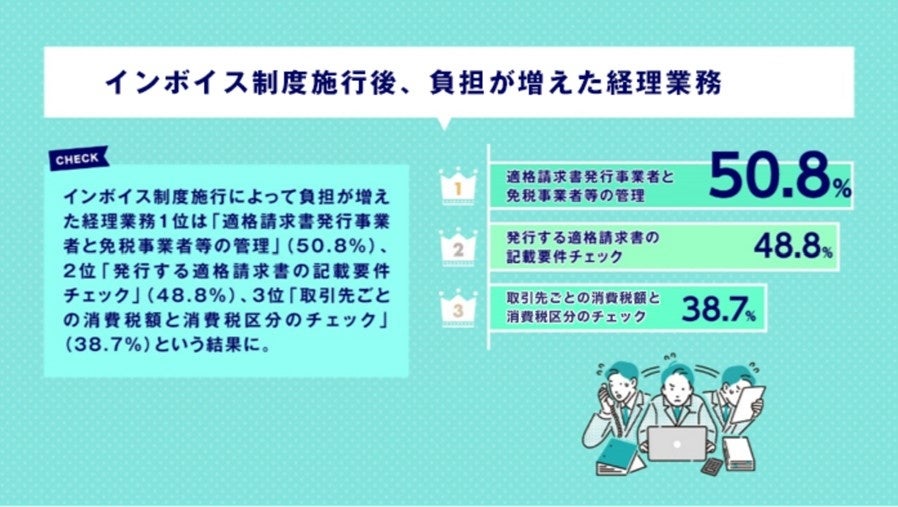 全国の企業に勤める経理担当者600名に対して、「インボイス制度施行後、負担が増えた経理業務はありますか。(複数回答可)」と聞いたところ、最も回答が多かった業務が「適格請求書発行事業者と免税事業者等の管理」で50.8%、2位が「発行する適格請求書の記載要件チェック」で48.8%、3位が「取引先ごとの消費税額と消費税区分のチェック」で38.7%であることが判明しました。