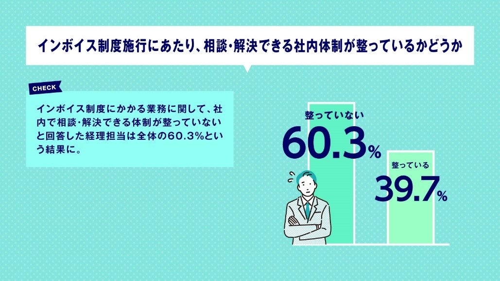 全国の企業に勤める経理担当者600名に対して、「あなたが勤める企業では、インボイス制度に関する業務について、 社内で相談・解決できる体制が整っていますか。」と聞いたところ、「整っている」と回答した割合が39.7%であることが分かりました。このことから、約過半数以上(60.3%)の経理現場ではインボイス制度にかかる業務に関して、相談・解決できる社内体制が整っていないことがうかがえます。