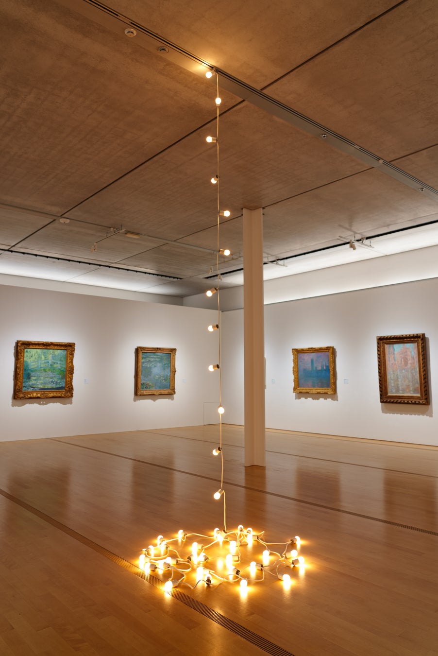 《「無題」(アメリカ #3)》(1992年)は42個の電球が連なる電気コードによって構成された「ライト・ストリングス」と呼ばれる作品のシリーズで、キャンディのシリーズに並ぶフェリックス・ゴンザレス=トレスの代表作のひとつです。彼の手がけた他の作品と同様、電球は身近にある一般的なものが使用されており、寿命が尽きると交換されます。このシリーズは、1991年に作家の恋人がエイズで亡くなった直後から、自身が同じ病でこの世を去る約1年前までの数年の間に制作されたもので、時間とともに消耗していく電球は、命の終わりや喪失を暗示しています。