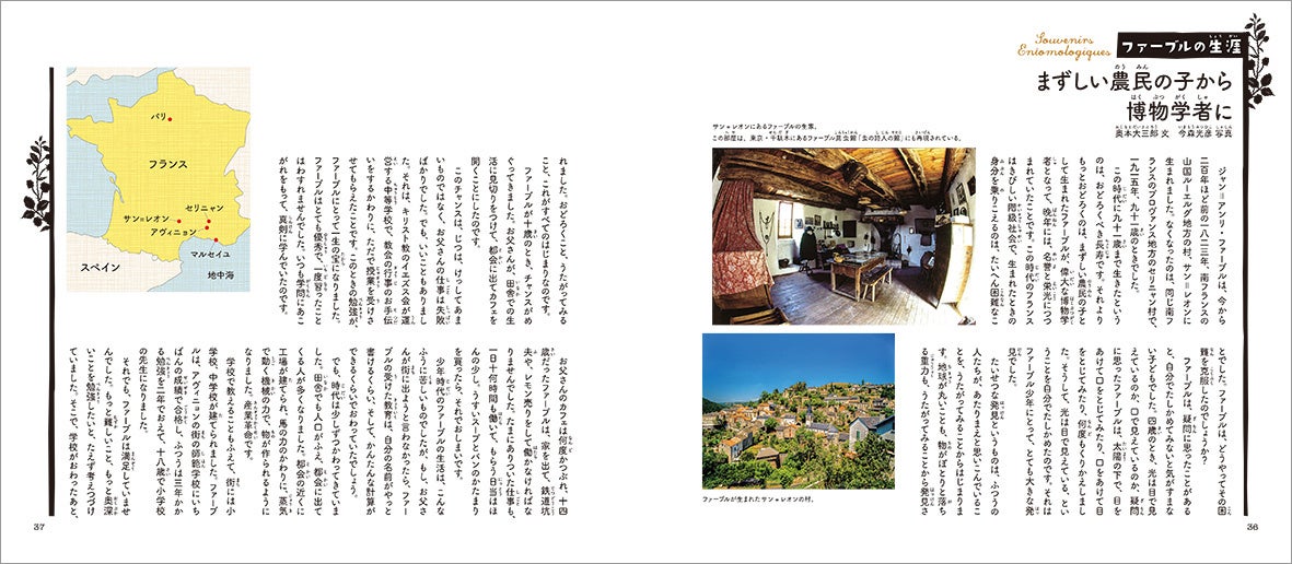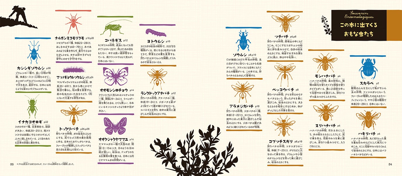 また巻末には登場する昆虫の一覧と、ファーブルの生涯やファーブルが愛した楽園「アルマス」についての解説を掲載しています。
