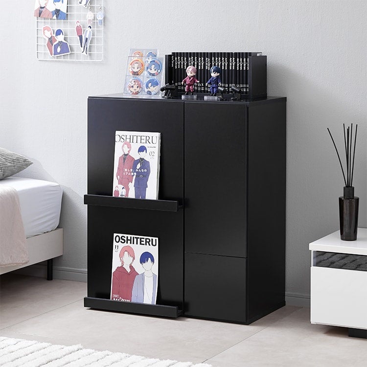 フラップ扉部分には雑誌を飾って「見せる」楽しみと、中身をしっかり「隠す」実用性を両立。仕事や勉強の合間に推しが視界に入る、モチベーション重視の理想的な空間です。