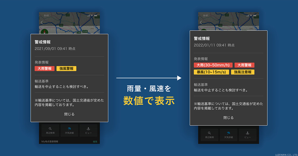 これまでは、警報/注意報の種類と輸送の目安のみを表示していましたが、具体的な数値も表示することで、感覚に頼るのではなく、輸送の目安にある基準値に照らし合わせて、輸送の判断が可能になります。