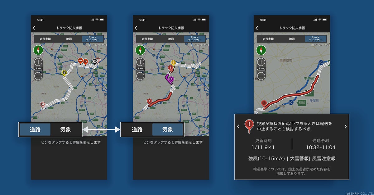 出発前だけでなく走行中でもルート上の気象状況を確かめられるようにすることで、ドライバーの安全確保や、災害時でも持続可能な輸送の維持を実現できればと思っております。