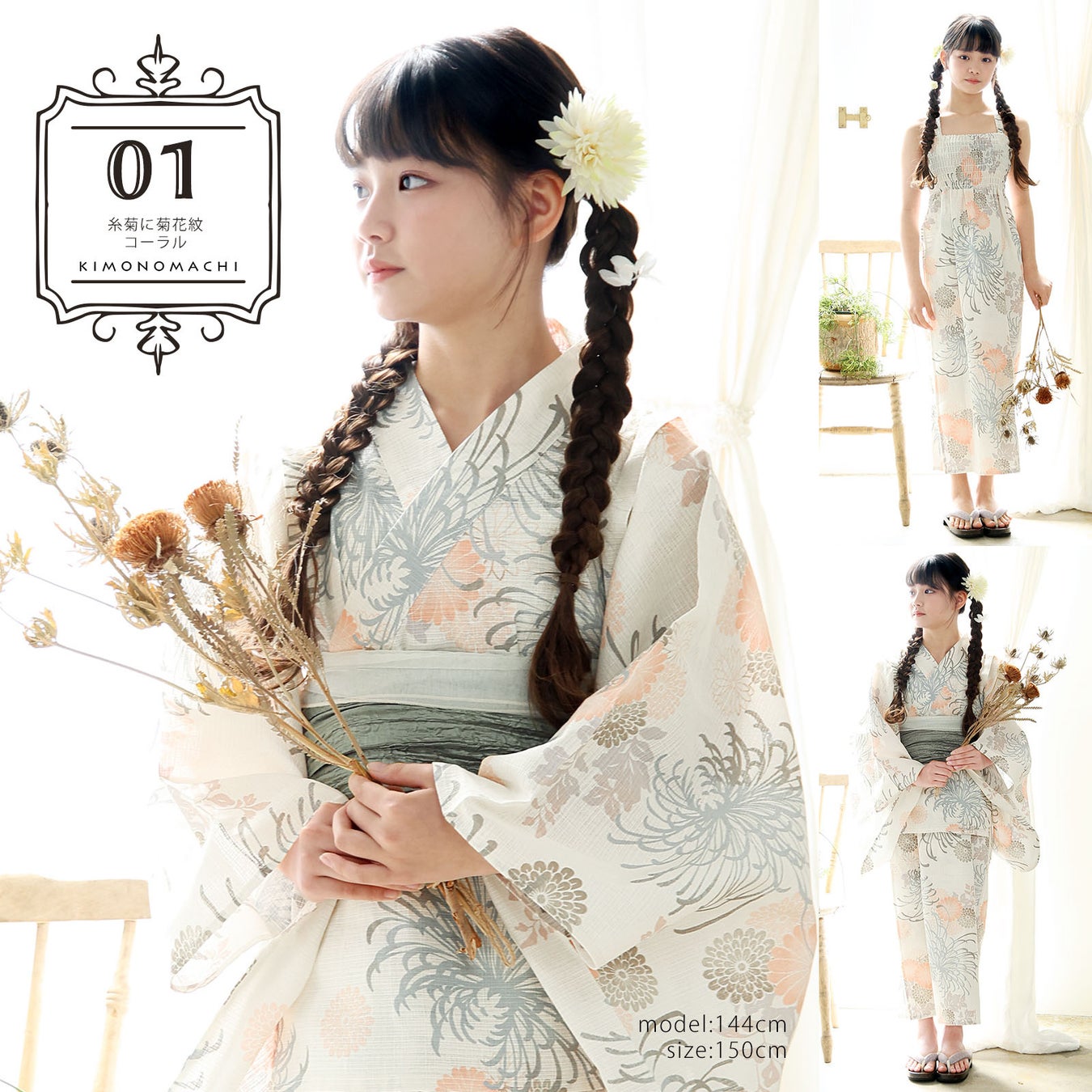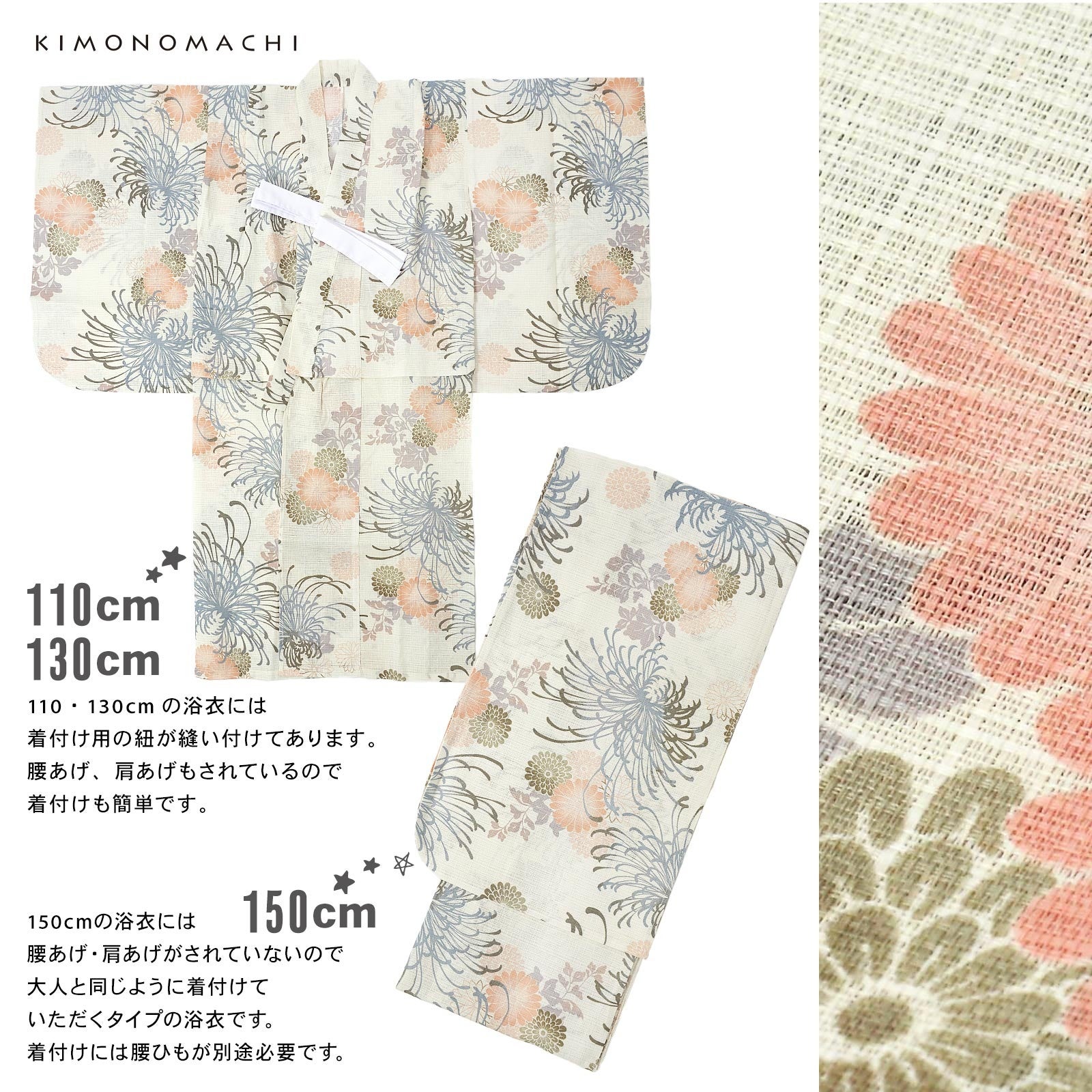 着付けが必要な伝統的な形の浴衣です。着付けといっても、130サイズまでは付け紐を結ぶだけ。150サイズは別途腰紐などを使用し、大人と同じように着付ける必要があります。