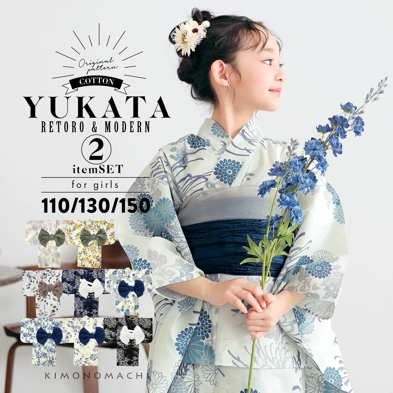 通常タイプ、2wayタイプともに、大人用オリジナル綿浴衣と共通のデザインとなっています。お客様のリアルな声を元にして、京都の図案家さんと協力し手掛けた色柄です。小柄なお子様が着てもきれいに柄が出るよう計算されているため、年代を超えた可愛らしさがあります。背伸びをしたい幼い女の子にも、大人びてくる年頃の子にもぴったりのデザインです。
