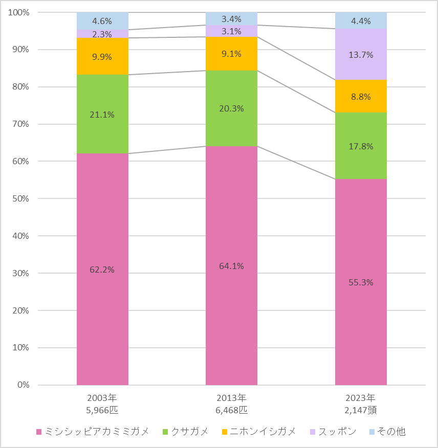 この「日本のカメ一斉調査」は10年毎に開催しており、2003年、2013年は両年ともミシシッピアカミミガメ、クサガメ、ニホンイシガメ、スッポンの順位でしたが、2023年にはスッポンとニホンイシガメの順位が入れ替わっていました。