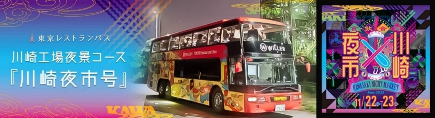 WILLER EXPRESS 株式会社(本社:東京都江東区、代表取締役:平山幸司、以下「ウィラーエクスプレス」)は、11月22日(火)・23日(祝・水)の2日間限定で、東京レストランバスの川崎工場夜景コース 『川崎夜市号』を運行します。それに先駆け、10月18日(火)より予約サイト「WILLER TRAVEL」(https://travel.willer.co.jp/restaurantbus/tokyo/kawasakiyoichi/)にて予約受付を開始します。