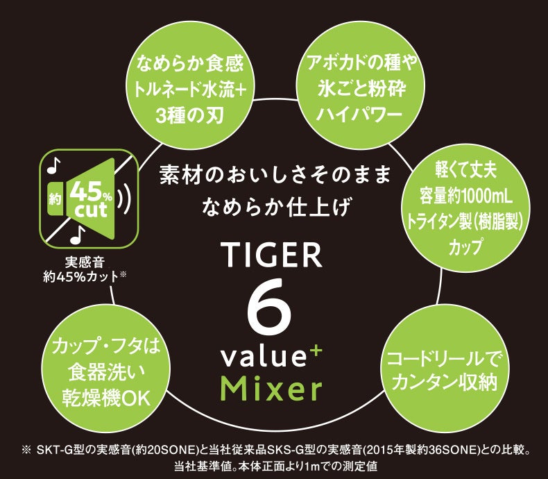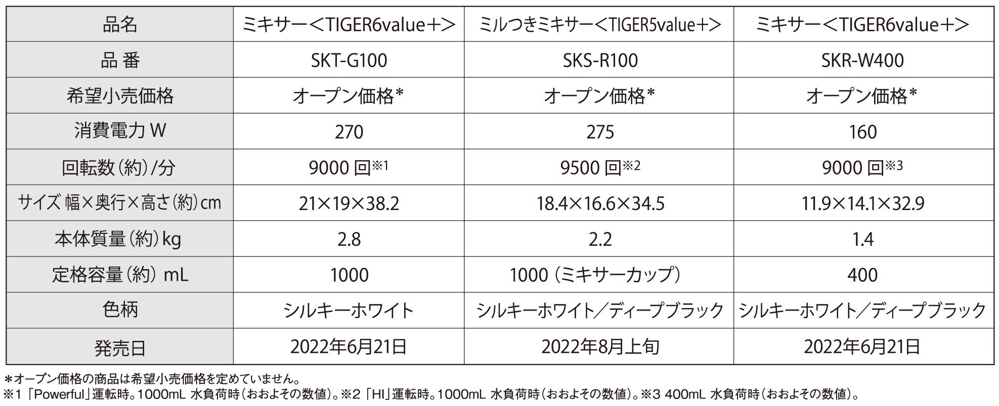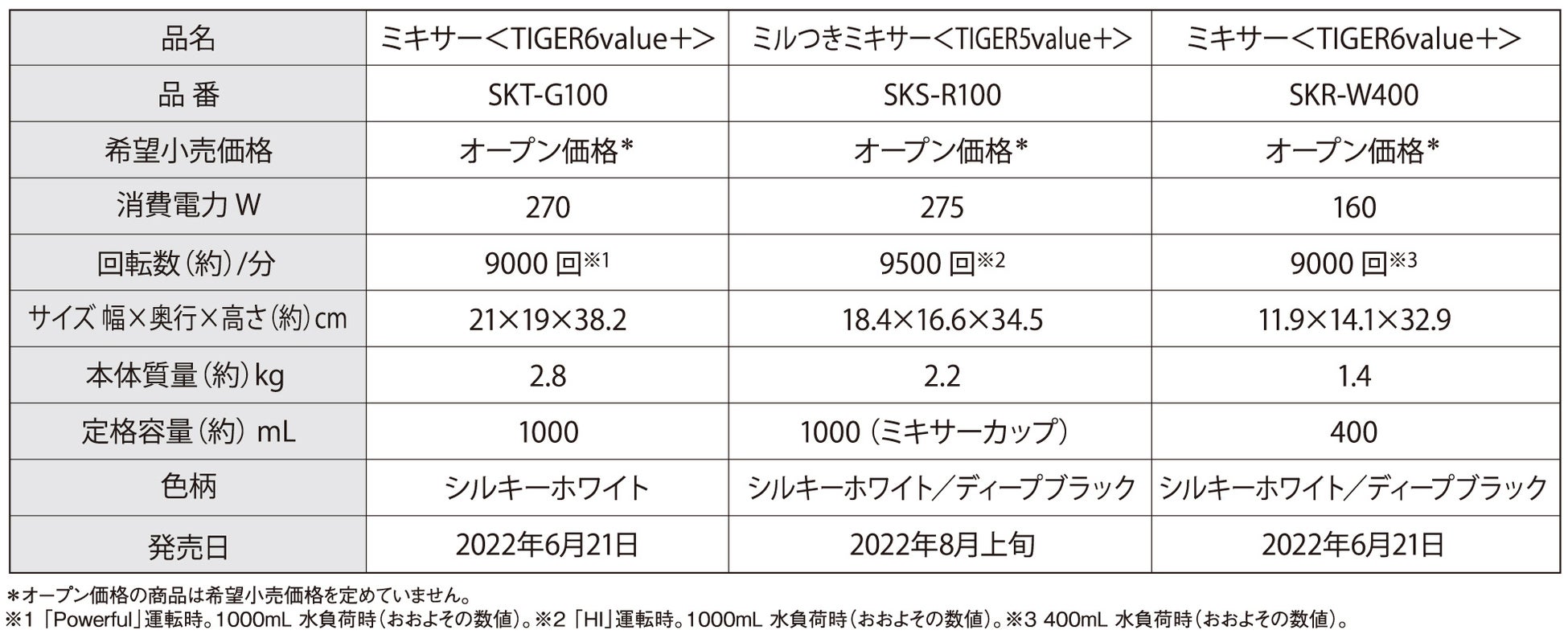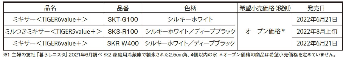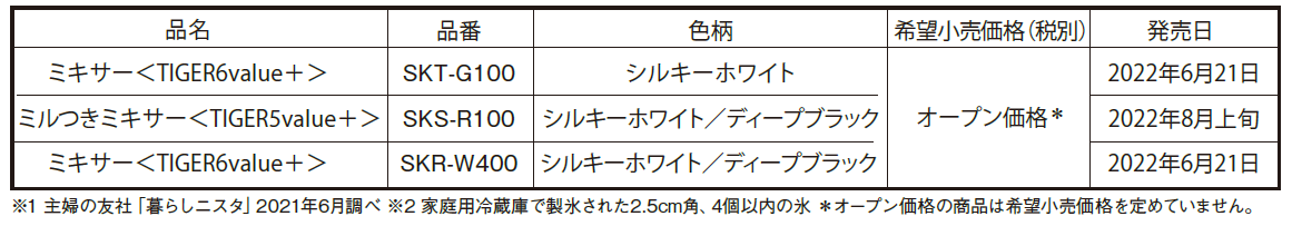 30~50代既婚主婦を対象にした調査では、「日常的に使っている調理家電」でミキサーは49.1%と約半数が使用しており※1、「調理の下ごしらえの時間が短縮される。」「コロナ禍で健康を気遣うようになり、毎朝スムージーを飲む。」など時短・健康などを意識する方々に支持を受けています。この度、当社では<value+Products>シリーズの第一弾として2022年6月21日に「ミキサー<TIGER6value+>SKT-G100」、「ミキサー<TIGER6value+>SKR-W400」の2製品を同時発売、「ミルつきミキサー<TIGER5value+>SKS-R100」を2022年8月上旬に発売いたします。