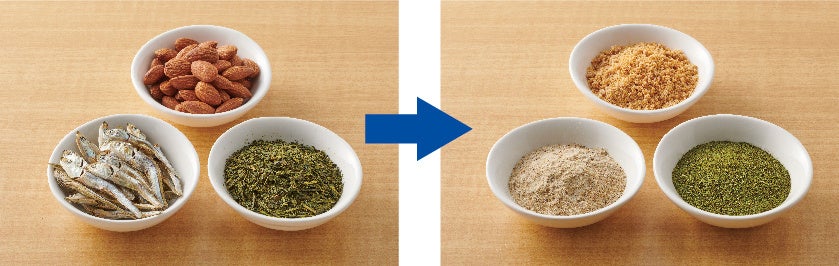 専用の「ミルカップ」で、煮干しを砕いて「だし粉末」や「アーモンドパウダー」、「コーヒー粉」を簡単に作ることが可能です。「お茶ミルカップ」は緑茶葉を粉末緑茶にできます。兼用の保存用ふたつき。