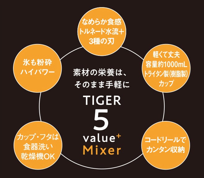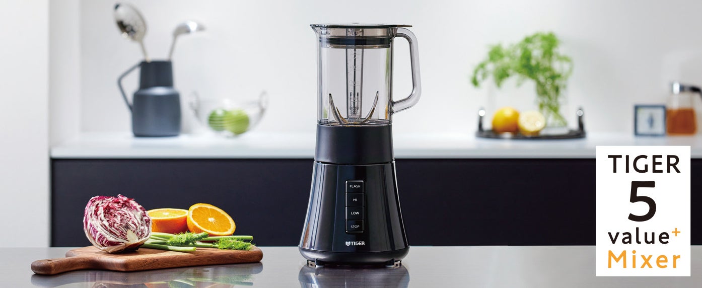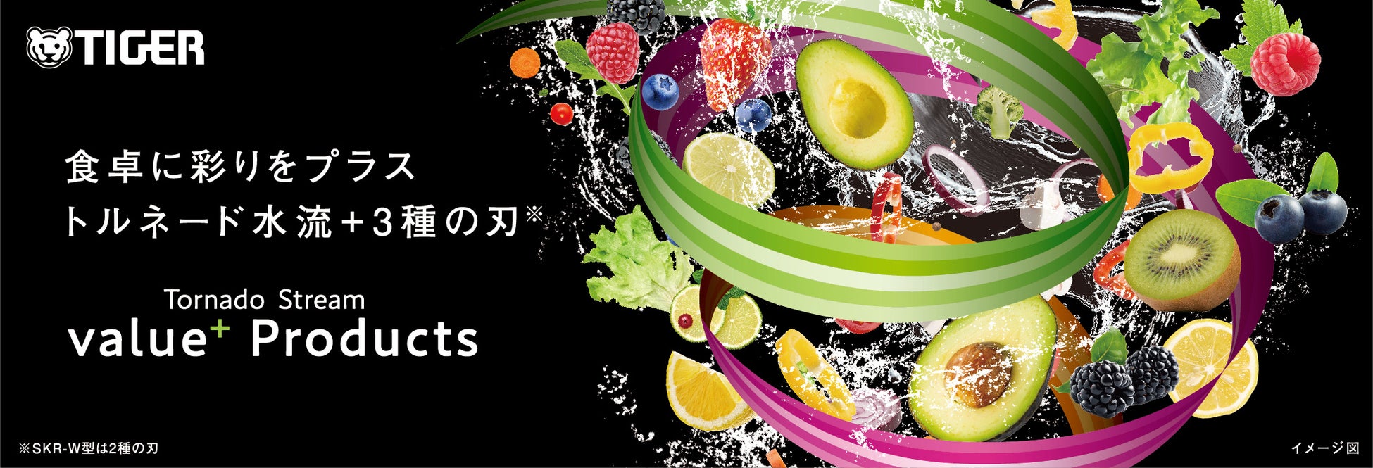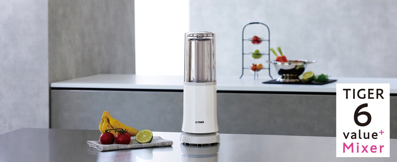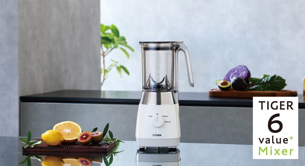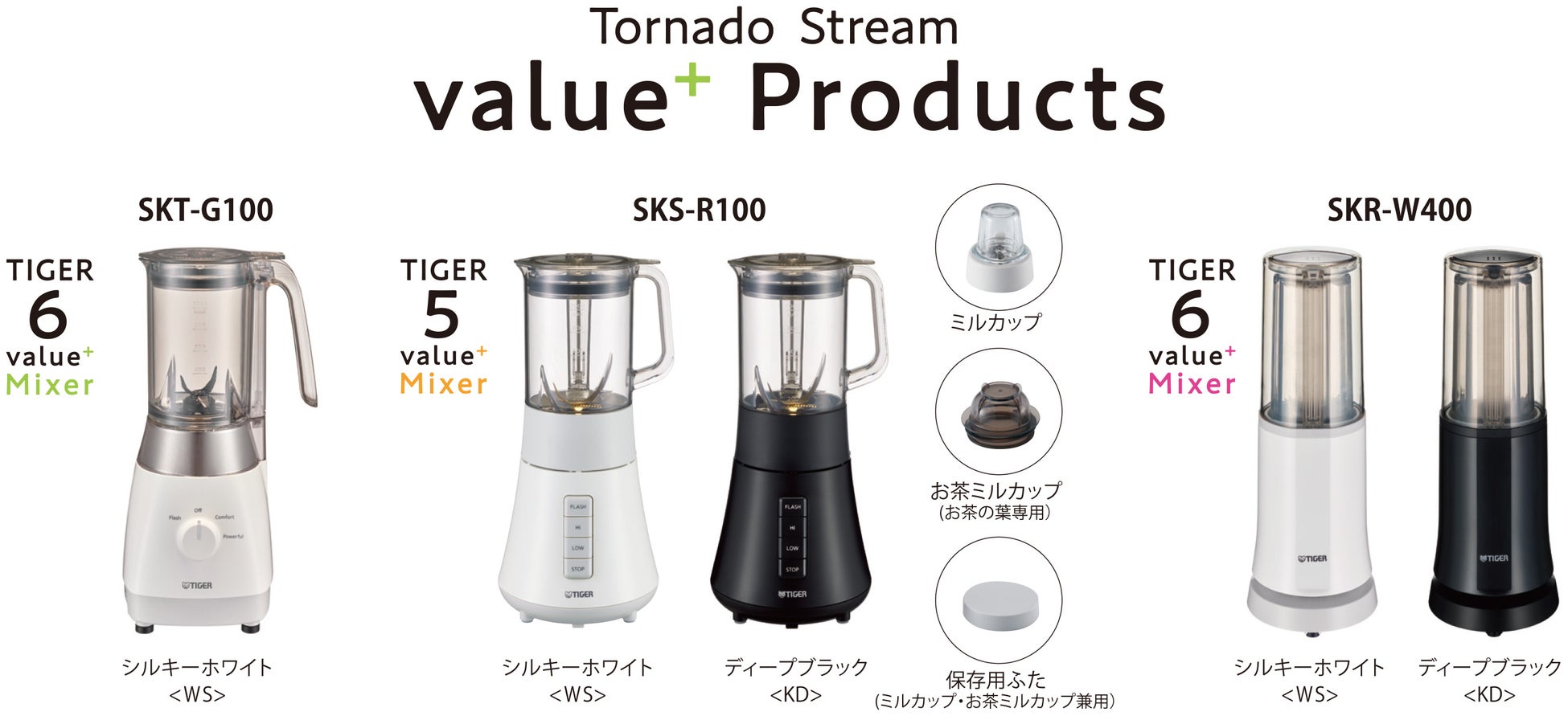 かたい食材や角氷から、葉野菜もしっかり砕くハイパワー!タイガー独自の“トルネード水流”でなめらか食感。毎日手間なくおいしい<value+Products>シリーズが登場! ~ミキサー3製品を発売~