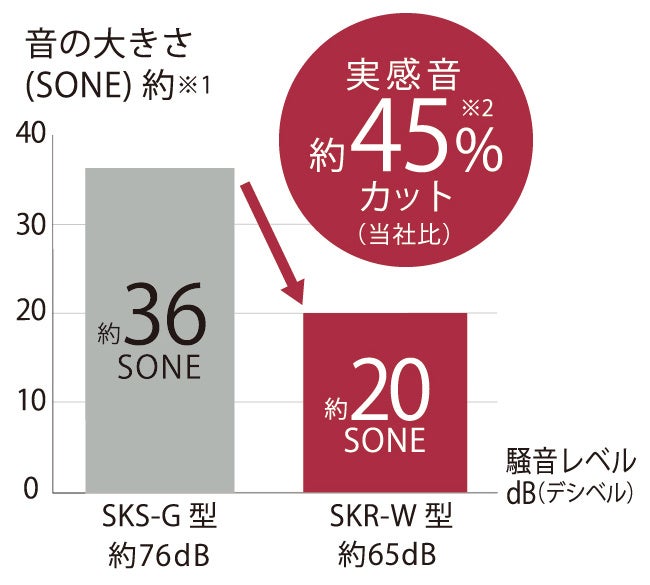 ※2 SKR-W型の実感音(約20SONE)と当社従来品SKS-Gの実感音 (2015年製約36SONE)との比較。当社基準値。本体正面より1mでの測定値