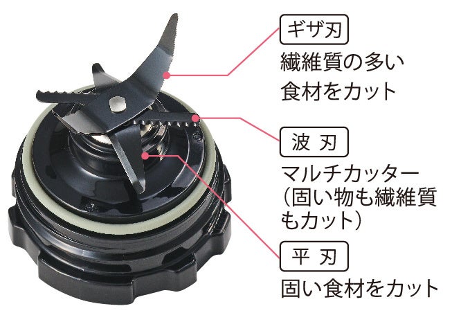 タイガー独自の「トルネード水流」で、上下を均一に混ぜることができ、残りがちな野菜の葉やくだものの皮を巻き込みしっかりと攪拌いたします。また、ステンレス素材にチタンをコーティングした「ギザ刃」「平刃」「波刃」の3種の形状の刃を組み合わせたチタンコート6枚刃で、砕き残りが起こりやすい人参などのかたい食材や角氷も簡単に細かく粉砕します。食材のおいしさや栄養はそのままに、なめらかな食感に仕上げます。②ミキサーカップ・ミキサーふたは食洗機OK!【New】